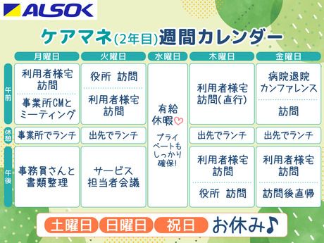 仕事内容 ★★★ メリットたくさん! ★★★ ■日勤のみ!夜勤なしでライフワークバランスも◎ ■ICT化(デジタル化)で業務効率UP ■育児が落ち着いたブランクある主婦活躍中 ■教育体制が整っているので初心者もOK! ■経験やスキルを活かす経験者も活躍中! 居宅ケアマネージャー業務全般をお任せします! ■ケアマネジメント業務全般 …アセスメントから給付まで ■各帳票作成 ■介護保険の諸手続きや 行政機関とのやり取りなど ■社内外の研修・会議への参加 利用者様とそのご家族の人生に寄り添う…そんなやりがいを感じられるお仕事です。 利用者様とそのご家族にしっかり向き合い、 話に耳を傾けることからお仕事が始まります。 状況を把握して相手が何を望んでいるのか、 きちんと汲み取っていければ大丈夫! 信頼関係がより良いケアプランに繋がります。 研修・教育体制が充実しており、未経験でも安心して働くことができます。初心者もベテランも活躍中! 入社後、週1回、1ヵ月間に渡る 独自のカリキュラムに沿った 研修を受けていただきます。 ワンツーマンでの個別研修なので、 未経験者でも安心して学べます。 他の業務に邪魔されることなく その日はみっちり受講◎ 今後のことや不安なことがあれば その時にお聞かせくださいね。 現職ケアマネジャーの声! ●ALSOK介護の良いところ ・ALSOKの知名度、安心して働ける企業。 ・以前に比べ社員の声を聞いてくれるようになった。 ・社内教育に力を入れている。(新人研修・本部研修) ・ALSOK介護内に多職種あるため、ケアプランの実践に向けて連携がとりやすい。 ・在宅から施設入居への移行も社内連携が可能、施設が多種あるので受け入れ体制を考えてくれる。 ●居宅ケアマネジャーのやりがい ・在宅なので家の環境や家族関係も人それぞれ異なる状況で「その人にとってその人らしいケアプラン」を作成し、 成果を得ることがやりがい。施設ケアマネだとケアプランが同じ内容になってしまう。 ・ご利用者様の人生の最期の大変な介護現場に一緒にいるので、介護が成功したらやりがいに感じる。 ・難解な支援でも、チームで動いてご利用者様の生活が改善すること。 ・どうしたらよいかわからず際の際にいる家族と本人の辛さを解決できること。つまらなかった生活が楽しい生活になること。 ●知人のケアマネに伝えたいこと ・上司部下の垣根が低くじっくり仕事に取り組める。 ・祝日休みで公休120 日、プライベートも充実できる。 ・ケアマネ同士のつながりがあり悩みを相談できる環境がある。 ・新たに導入されたインセンティブ制度で頑張った分だけしっかり稼げる。 ・大型化によって自分達で事業所を作り上げたので今が楽しい。離職した人に会ったときに楽しそうで変わったと言われた。 ・会社がしっかりしていることをアピール。 ・大きい会社なのでケアマネ以外の職種でも働ける。