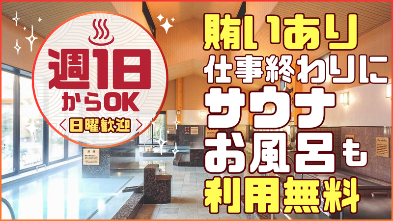 仕事内容 女性スタッフの募集になります! (※女性更衣室での業務があるため) ★シフト日以外も、施設利用無料! 女性専用浴室・更衣室の巡回を含むため 【女性スタッフ限定】の募集になります。 ୨୧┈┈┈┈┈┈ ・✦✦・┈┈┈┈┈┈┈୨୧ ✅ 週1日~OK! ✅ 22時以降は時給25%UP ✅ 土日祝は時給50円UP ✅ 施設利用タダ! ✅ 絶品まかないあり♩ ୨୧┈┈┈┈┈┈ ・✦✦・┈┈┈┈┈┈┈୨୧ \土曜・日曜日を積極採用中!/ 20:30~24:45(実働4時間15分) \その他、積極採用中!/ 日曜日:12:30~16:30 火曜日:16:30~20:30 土曜日:20:25~24:50 // ⭐休日でもサウナ・お風呂無料♬ スタッフにも人気の絶品賄いあり⭐ \\ サウナ・お風呂好きな方必見! 終業後も休日も施設の利用が無料♬* お仕事を頑張った後に、 サウナで汗を流してお風呂に入り 疲れを取って帰るスタッフが多数☆。・ まかないもあるので、仕事の日は 帰ったら家で寝るだけなんて方も!(笑) 未経験や久しぶりのパート、 初めてのアルバイトの方も大歓迎! シフトの融通も利くのでお勧めです! * ▼仕事内容▼ フロントでの受付や接客などを お願いします! 利用者さんが快適に時間を過ごせるように 館内でお困りのお客様がいたら お声かけいただくことも。 他にも館内の巡回業務などもあります。 (女性専用浴室・更衣室の巡回含む) 利用者さんは老若男女問わず様々な方に ご愛顧いただいていますので 接客が好きな方や お世話をするのが好きな方大歓迎です! アルバイト・パート未経験の方も大歓迎!