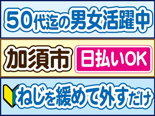 仕事内容 カンタン・シンプル!軽作業スタッフ大募集 初心者さんも安心、ねじを緩めて外すだけ 定着率も抜群、50代の中高年の方も活躍中 【軽作業スタッフのポイント】 〇未経験OK 〇日勤のみ(2時間に1回小休憩あり) 〇土日祝休み 〇時給1,150円スタート 〇20代30代40代50代前半の男女活躍中 〇日払いOK(規定内) 〇交通費支給(規定内) 〇履歴書不要 〇「マイリク定着支援」導入企業 【軽作業スタッフの仕事内容】 加須市にあるリサイクルセンターでのお仕事 リサイクル・リユースされる遊技機の 分解作業をお任せします 具体的には、 電動ドライバーを使用してネジを外し、 部品を取り外していくシンプルな作業です。 職場見学(30分~1時間程度)を実施しております。 【軽作業の勤務について】 〇土日祝休みの週休2日制 大型連休あり 〇日勤のみ 8時半~17時40分(実働8時間) 2時間に1回小休憩あり 急な発熱・体調不良・冠婚葬祭など、 突発的なお休みに柔軟に対応しております。 【こんな経験活かせます!】 下記経験者は前職活かせます。 〇製造業パート・アルバイト 〇リサイクルショップパート・アルバイト 〇組立・組付パート・アルバイト 〇分解・仕分けパート・アルバイト 〇軽作業パート・アルバイト 〇倉庫内派遣 〇主婦・主夫パート 前職不問で採用しております。 ブランクのある方もOK(経験の浅い方もOK) 〇ご不明な点はお気軽にお問い合わせください〇 お電話でのご応募、ご質問も受付中! 株式会社ロフティー 白岡支店 担当営業、または採用担当まで TEL0800-222-6888(フリーダイヤル) お仕事情報など採用ページはこちら https://entori.jp/lofty-shiraoka コーディネーター・定着支援のWサポート体制導入 「マイリク定着支援」導入企業! アンケートで職場の様子を確認し、 コーディネーター・定着支援担当が連携してサポート。 はじめての派遣でも安心して働けるよう迅速かつ 丁寧にサポート対応いたします。