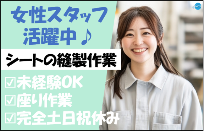 仕事内容 座ってできる! 工場内でのもくもく軽作業♪ ◎シートの縫製作業 部品をシートにくるんで周囲を縫製するお仕事になります! 製品によってサイズが異なるため手縫い、もしくは業務用のミシンを使用します! ミシンは足でペダルを踏むと縫い進むかんたん操作なので縫製のお仕事の経験が ない方も問題なく作業ができます♪ 工場でのお仕事経験がある方は歓迎ですが、未経験の方もご応募OK! 特別なスキルや資格は必要ありません! 手を使う作業やモクモク作業がしたい方にオススメ♪ 基本座り作業で重量物の取り扱いもなし! 過去には直接雇用への切替実績もあり! 長期でお仕事をしたい方にもオススメ♪ 完全土日祝休みの工場なので 働くママさんも多数活躍中♪ ===ここもチェック!=== ■長期 ■未経験者歓迎 ■経験者歓迎 ■学歴不問 ■即日勤務OK ■ブランクOK ■フリーター歓迎 ■社会保険完備(雇用保険、健康保険、厚生年金) ■健康診断あり(年1回/会社負担) ■交通費支給 ■40代以上応募可 =================