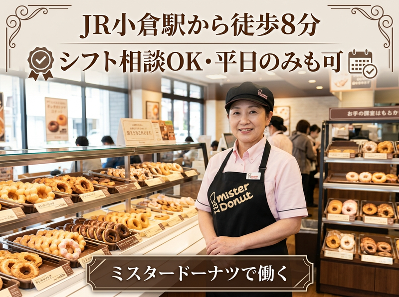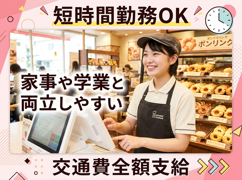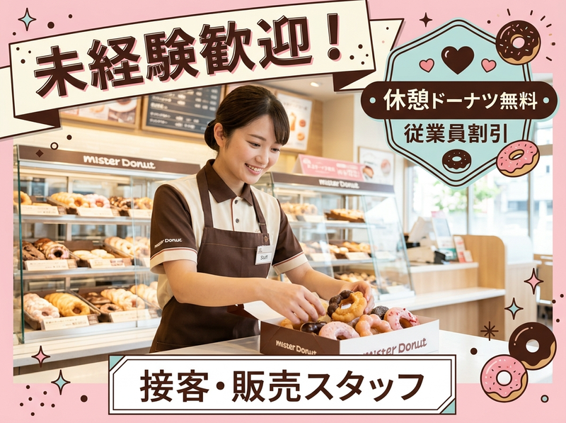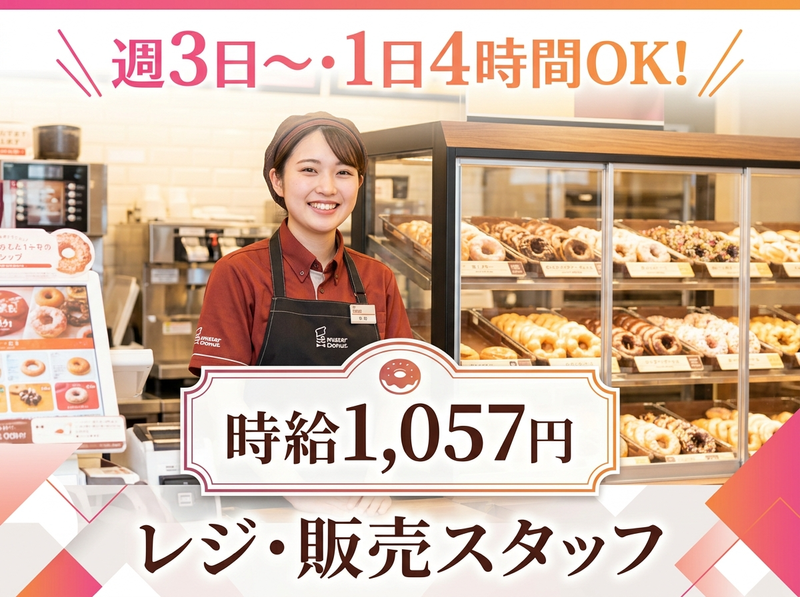 仕事内容 ミスタードーナツ店舗での**接客・販売(レジ業務)**を担当していただきます。 ⭐具体的には ・レジでのお会計対応 ・ドーナツの箱詰め ・ドリンクの簡単な準備 ・商品の陳列や補充 ・店内の簡単な清掃 ・お客様対応 まずはレジや箱詰めなどの簡単な作業からスタートし、 少しずつ仕事を覚えていきます。 先輩スタッフが丁寧にサポートしますので、 接客未経験の方でも安心して始められるお仕事です✨ 甘いドーナツの香りに包まれた明るい店内で、 お客様に笑顔で商品をお届けするお仕事です! アピールポイント ⭐ 週3日~・1日4時間~勤務OK 短時間勤務も可能なので、予定に合わせて働きやすい環境です✨ ⭐ 未経験スタート歓迎 レジや接客は先輩スタッフが丁寧にサポートします。 ⭐ 休憩時ドーナツ無料 ミスタードーナツならではの嬉しい特典です。 ⭐ 従業員割引あり 人気のドーナツをお得に購入できます✨ ⭐ 交通費支給(上限なし) 通勤距離がある方も安心して働けます。 甘いドーナツの香りに包まれながら、 楽しく働ける明るい職場です⭐