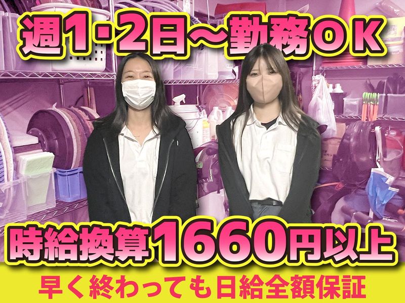 仕事内容 ✨作業が早く終わっても日給全額保証!✨ 某有名高級ホテル・ビル・マンションなどの施設内にてワックスがけ、カーペット清掃、ガラス清掃など施設内清掃業務全般を行います。 その他、池やカーペットなどの特殊な清掃もあり。 ■基本2~3名のチーム作業。 ■現場へは事務所からワゴン車等で向かいます(直行・直帰も可能)。 ※専門知識・経験は一切不要です!難しいことはなく未経験でも始めやすいお仕事です。 随時研修もありますので、未経験・ブランクがある方でも安心です♪ ✨ここがポイント1✨ 土日祝の週1・2日~勤務OKなので、Wワークをしながらお仕事ができます! 基本残業はほとんどないため、プライベートやご家族との時間も大切にできます。 ✨ここがポイント2✨ 作業が早く終わっても日給は全額保証(実際に慣れてしまえば早めに終わることも多々あります) ✨ここがポイント3✨ 学歴・経験・スキル一切不要! ほとんどのスタッフが清掃未経験・異業種からの転職組です。 一から丁寧に指導するので安心してキャリアアップが可能です。 ※女性スタッフも多数活躍中です!