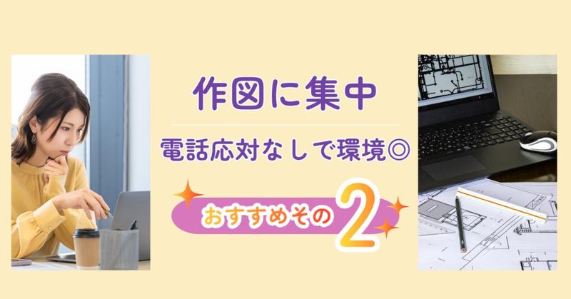 職場環境 日々業務の指示を頂きながら、図面に集中できる環境です。 不明点などは優しく教えてくださいます。 またお休みなども取得し易い環境で、長期で働くにはとても良い環境です。