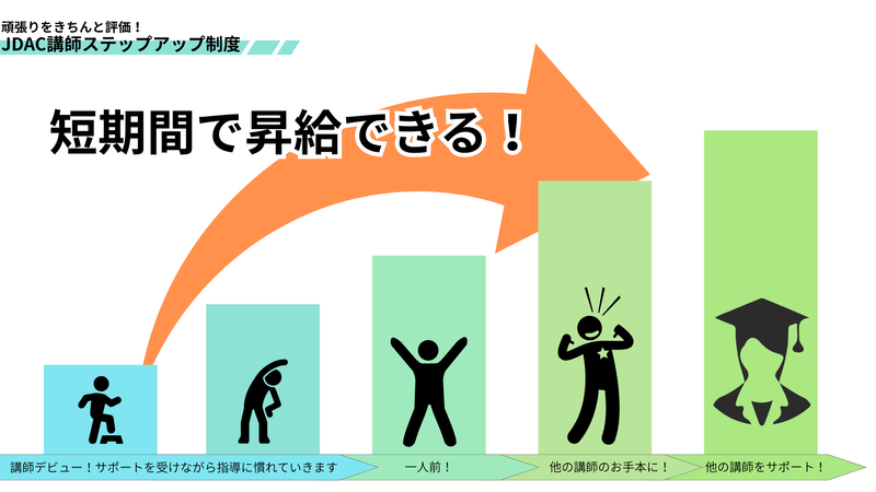 仕事内容 ダンスで「未来の人間力」を育むパートナー募集! JDACダンススクールは、そんな想いを持つ20代・30代が輝ける場所です。 私たちが大切にしているのは、ダンスの技術を競うことではありません。 ダンスを通じて「自己肯定感」「コミュニケーション能力」「考える力」を育む、新しい教育の形です。 昇給制度あり! 3か月継続:3,000円〜/半年継続:3,500円〜 短期間で時給アップが目指せる環境です。※諸条件あり 💎 JDACだからこそ得られる「3つの武器」 1. 「一生モノの資格」が手に入る スポーツ庁や厚生労働省、子ども家庭庁などが後援する研修を受けて取得できる「ダンス指導者ライセンス」を全額スクール負担(28,000円相当)で取得可能。 独学では得られない、学校教育にも通ずる「正しい指導法」が身につきます。 2. 「教えるプロ」としてのキャリアを徹底サポート ただのアルバイト・副業で終わりません。 研修会を通じて全国の求人情報や指導案件へアクセスできるようになり、プロのダンスインストラクターとしての道が大きく開けます。 3. 教育型カリキュラムで「人間力」を磨く JDAC独自の「教育型ダンス」は、子どもたちの表情や行動を劇的に変えます。 「先生に出会えてよかった」という言葉は、何物にも代えがたいあなたの財産になるはずです。 📝 お仕事の内容 対象: 幼児、小学生、中学生 ジャンル: HIPHOPを中心としたリズムダンス 主な内容: オリジナル教材を使用した「生きる力」を育てるダンス指導 生徒一人ひとりの個性を引き出すコミュニケーション ★本部のカリキュラムがあるため、指導経験がなくても「伝えたい想い」があれば大丈夫です! 🌟 先輩講師の声(20代・副業) 以前は自分のスキルアップばかり考えていましたが、 ここで教え始めてから『どうすれば相手に伝わるか』を深く考えるようになり、自分自身のダンスの表現の幅も広がりました。 公的な資格が取れたことも、将来への自信に繋がっています!