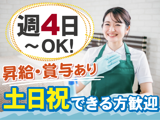 仕事内容 \週4日~5日勤務できる方、積極採用!/ リゾートホテルの客室清掃パートさん大募集! 土日祝に勤務可能な方、大歓迎! ◎未経験スタートOK ◎昇給あり ◎賞与年2回支給 < 仕事内容/客室清掃 > ・ホテル内客室の清掃、ゴミ集め ・リネン交換(シーツ・タオル等) ・浴室、トイレ清掃 ・アメニティ補充 ・掃除機かけ、など 客室清掃業務全般をお任せします。 清掃業務は女性が多い印象があるかもしれませんが、男性も多数活躍しています。 学生さんから主婦(夫)さん、中高年層の方など働くスタッフはさまざまです。 宿泊施設での清掃経験がなくても大丈夫! 先輩が丁寧に教えるので、男女・経験問わず気軽にご応募ください。 < 就業場所 > ホテルパームスプリング 湯本駅から車7分の好アクセスで通勤もラクラク! 無料駐車場があるので車通勤も安心です。 < 働きやすいポイント > ◆アルバイト・パートさんも賞与あり ◆頑張り次第で昇給あり!収入アップ ◆週4日~5日程度×1日5.5時間程度で適度に働ける! ◆無料駐車場付きだから通勤も安心! 勤務時間数により各種社会保険も加入できます。 自分のペースで働きやすいので、長期勤務を希望される方にもおススメ。 清掃ワーク初心者の方も興味があればOK!ご応募お待ちしております!