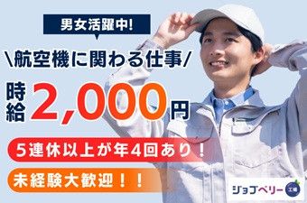 仕事内容 日勤でも月収39万円以上可!目指せ湾岸ワーカー!【愛知県飛島村】\大手企業で航空機やヘリコプターを作るお仕事/高時給2,000円★未経験OK★男性・女性大活躍!☆喫煙スペースあり☆ <仕事内容> 【働く職場は 大手製造メーカー】 陸・海・空・宇宙に及ぶ事業領域の広さと高い技術が魅力の一流製造メーカーです。 航空機や航空エンジンなど世界的な製品に携われるのが魅力。 主な業務は、塗装/組立/検査/試験/測定/整備/修理補助の作業などがございます。 【お願いする仕事はこちら】 ※下記いずれ方の製造ラインに配属となります 1,塗装(塗りなおし作業) 製品にきれいな色を塗って、ピカピカに仕上げるお仕事。 2,飛行機の部品組立(工具を使った組立作業) プラモデルを作るみたいに製品を組み立てるお仕事。 エアードライバーという簡単操作できる工具を使って組付けたり 機械にセットしてスタートを押す作業です。 機体に向かって穴をあけていく作業などもあります。 3,検査(製品の測定や不具合の検査) 指示書を見ながら航空機胴体のチェックをお願いします。 部品と部品がしっかり接着されているか? 正しい寸法で組立されているか? 製品をじっくり見て、サイズを測り「これでバッチリ!」と品質チェックをお願いします。 4,修理・整備(完成品の修理・メンテナンス) 完成した製品を点検して長く元気に使えるように手入れをする、お医者さんみたいなお仕事です。 ライン作業です。 立ち作業となります。 個人作業・グループ作業どちらもございます。 《職場環境》 男性が多い職場です。 冷暖房完備 スポットクーラー有り ロッカー有り|休憩室完備|売店有り|診療所有り アピールポイント <仕事内容> 【働く職場は 大手製造メーカー】 陸・海・空・宇宙に及ぶ事業領域の広さと高い技術が魅力の一流製造メーカーです。 航空機や航空エンジンなど世界的な製品に携われるのが魅力。 主な業務は、塗装/組立/検査/試験/測定/整備/修理補助の作業などがございます。 【お願いする仕事はこちら】 ※下記いずれ方の製造ラインに配属となります 1,塗装(塗りなおし作業) 製品にきれいな色を塗って、ピカピカに仕上げるお仕事。 2,飛行機の部品組立(工具を使った組立作業) プラモデルを作るみたいに製品を組み立てるお仕事。 エアードライバーという簡単操作できる工具を使って組付けたり 機械にセットしてスタートを押す作業です。 機体に向かって穴をあけていく作業などもあります。 3,検査(製品の測定や不具合の検査) 指示書を見ながら航空機胴体のチェックをお願いします。 部品と部品がしっかり接着されているか? 正しい寸法で組立されているか? 製品をじっくり見て、サイズを測り「これでバッチリ!」と品質チェックをお願いします。 4,修理・整備(完成品の修理・メンテナンス) 完成した製品を点検して長く元気に使えるように手入れをする、お医者さんみたいなお仕事です。 ライン作業です。 立ち作業となります。 個人作業・グループ作業どちらもございます。 《職場環境》 男性が多い職場です。 冷暖房完備 スポットクーラー有り ロッカー有り|休憩室完備|売店有り|診療所有り \充実した福利厚生/ ◎社会保険・雇用保険完備 ◎有給休暇有(6ヶ月経過後、10日付与)※規定あり ◎残業手当 ◎交通費支給(規定内) ◎確定拠出年金制度 ◎週払い制度(週3回対応) ◎お友達推薦制度あり(規定有り) ※1名につき3万円~10万円臨時給与として支給 ◎車(マイカー)・バイク通勤可(無料駐車場あり) ◎制服貸与 ◎食事持参可 ◎社員食堂あり(1食350円~500円程度) ◎ロッカー・休憩室利用可 ◎売店あり ◎診療所あり ◎福利厚生プログラム (宿泊、グルメ、ショッピングなど大幅割引が受けられる10万アイテムのメニューがあります。)