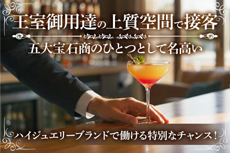 職場環境 世界的ハイジュエリーブランドでのお仕事✨ 王室御用達の上質な空間で、お客様に心地よい時間を提供できます。 高時給2,500円~/週3日~/WワークOK/登録制だから無理なく働ける環境♪ バーテンダーとしての経験をしっかり活かせる、やりがいある職場です。 喫煙所:喫煙所あり(屋外)