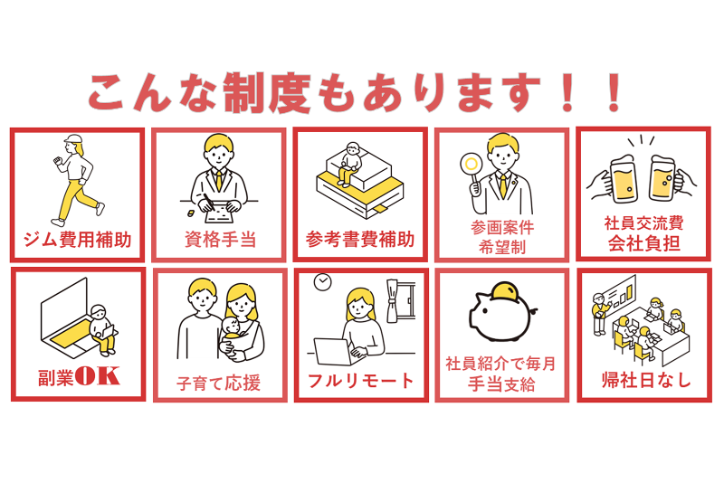 アピールポイント: ① 案件選択制 → ご希望とずれる案件は提案しないよう徹底しています。 ➁ 元請直案件中心 → 商流が浅く、条件や役割がより明確な案件に参画いただけます。 ③ 低い離職率 → 2020年の創業以来、エンジニアの方の離職は1名のみです。 【その他アピールポイント】 ・フルリモート可能 ※ 現在活躍している正社員は、全員フルリモートで活躍しています。 ・20~30代活躍中(平均年齢は34歳) ・残業少なめ(月平均8時間未満、ほぼ定時で上がれます) ・有休消化率95%(2022/23年度は100%) ・帰社日なし ・現場レポートの提出なし ・社内転職可能(エンジニアから営業職や企画職への異動が可能)