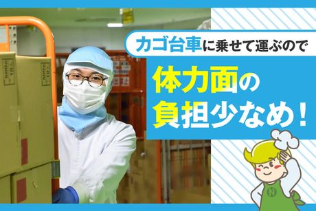 仕事内容 \食品工場の空調完備の倉庫で荷受けスタッフ/ 介護福祉施設向けのお食事を作る食品工場で 『食材・資材の荷受け』 空調完備で快適な倉庫内でのお仕事です! 着替え時間も実働に含まれます! 子育てが落ち着いたタイミングの主婦さんや、 Wワークで働くフリーターさん、 早朝の短時間で授業がないときに活躍する学生さん など 幅広い世代が活躍しています! \お仕事内容をご紹介/ ・配送業者から届いた食材や資材の荷受け ・各現場への払い出し業務 ・在庫管理 など カゴ台車を使って運搬するので、 重たいものを持ったまま運ぶ・・・ みたいなことはありません! 到着したトラックから荷物を降ろすのは、 ドライバーさんが対応してくれるので安心! <タイムスケジュールをご紹介!> 5:45~6:00 着替え~現場へ移動(着替え時間も給与に含まれます!) 6:00~8:00 荷受けピークタイム!トラックからの荷下ろしはドライバーさん主導です。 カゴ台車に乗せた荷物を倉庫に移動します。(倉庫は空調完備!) 8:00~9:00 荷受けが少し落ち着き、お片付け・倉庫で各部門の必要分を準備 <正社員登用制度あり> ・40代~50代からも正社員へチャレンジ可能! ・キャリアアップをお考えの方応援! 【直近1年の実績】 6名(20代2名/30代1名/40代1名/50代2名) ※登用枠は職種、組織戦略による <入社お祝金制度あり> 3ヶ月勤務いただいた感謝の気持ちを込め、 入社3ヵ月経過後、入社お祝い金として 『1万円』が支給される制度です。 ※支給時期は社内規程による。 <こんな経験を持った方が活躍中> 給食サービスをはじめ、さまざまな職種の 経験者が集まっています。 社員食堂や職員食堂での勤務経験がある方や、 学校給食や施設内厨房で働いていた方々も多数在籍しています。 また、物流倉庫内での軽作業や 工場内での軽作業の経験者、 物品管理や工場作業に携わっていたスタッフもいます。