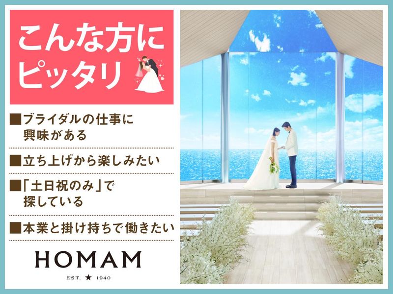仕事内容 ✅オープニングスタッフ募集♪ ✅土日祝のみ!週1~・1日4時間~OK◎ ✅新入生歓迎!学業ともしっかり両立♪ 2026年3月にオープン★ HOMAM 旧マッケンジー邸は 国登録有形文化財の洋館と調和した 駿河湾の絶景を一望できる クラシカルな結婚式場です。 【お仕事内容】 結婚式のお手伝いをお任せします♪ <具体的には…> ■会場の準備 ■お客様の上着や荷物のお預かり ■お席のご案内 ■結婚式のお料理・ドリンク提供 ※キッチン業務はありません◎ 最初は結婚式の見学からスタート! 研修では同世代を集めて、 お盆の持ち方などからレクチャーします♪ 飲食業やホール・接客が初めての方も ご安心ください♪ ================ \学生さんに人気/ オススメポイントをご紹介♪ ================ ・週1日~・1日4時間~OK! ・学校やサークルのない日に働ける! ・シェフによる絶品のまかないあり! ・バイト仲間ができる♪ ・就活や社会で役立つマナーが学べる! みんなで助け合える温かい雰囲気なので、 長続きするスタッフが多数♪ 結婚式の準備中は、 文化祭みたいな雰囲気なんです♪ 素敵な仲間にも出会えます(^^) ―――――――――――――――― 【仕事の流れ】 1.ミーティング 披露宴の流れやお料理について スタッフ間で事前に確認して 式中にバタバタしないようにします◎ 2.披露宴会場の準備 お席に置く名札や ゲストの方に渡す引き出物を確認したり グラスを磨いたりして準備します。 3.お客さまのお出迎え 荷物をお預かりし、 待合室でドリンクをお出しします! 4.ホール業務 お席にご案内し、順番にお料理や ドリンクを提供します◎ ―――――――――――――――― 面接日・勤務開始日は相談OK! 電話での応募やお問い合わせもお気軽に☆ ⇒TEL︓【054-291-5445】 ――――――――――――――――