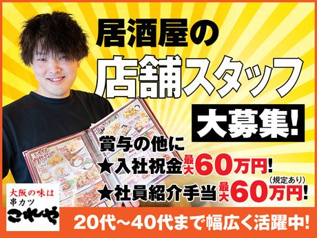 仕事内容 未経験から店長へ。エリア外転勤なし!年数回の昇格・昇給も可能! 未経験からスタートしたスタッフ多数活躍中! 基礎から学べる教育体制と、 頼れる先輩のサポートで安心して成長できます。 ー・ー・ー・ー・ー・ー・ー < このお仕事のミリョクPoint!> ●入社1年目から平均月収36.5万円も可能! ●入社祝金最大60万円!/規定あり ●社員紹介手当最大60万円!/規定あり ●食事補助あり!(1勤務に1食無料) ●動画マニュアル完備!安心の教育体制! ●髪型・髪色自由!※規定あり ●前給制度あり※規定あり ●社員割引(会計から20%オフ) ●カンリー福利厚生導入中! (映画・ネイル・コンビニなど数百種類の割引が利用し放題) ー・ー・ー・ー・ー・ー・ー <お仕事内容> 本場大阪の味が自慢の串カツ居酒屋 「これや」で店舗スタッフのお仕事! ●接客や料理の配膳などのサービス業務 ●一品料理の調理や串の仕込み ●シフト作成・売上管理などをお任せ! ー・ー・ー・ー・ー・ー・ー <自己申請昇格制度あり> 年数回の昇格・昇給も可能! 2年目で店長になった方も! 【キャリアアップ例】 店舗スタッフ ↓ 店長 ↓ チームリーダー ↓ エリアマネージャー ↓ 部長 ー・ー・ー・ー・ー・ー・ー <これや社員のスケジュール> ※実働8時間のシフト制 営業時間15:00~翌2:00 の場合 15:00~ 出勤!今日も1日頑張りましょう! 15:00~16:00 オープン前準備 16:00~23:00 接客・調理 (※途中休憩1時間あり) 23:00~ 退勤!お疲れ様でした☆ミ ー・ー・ー・ー・ー・ー・ー <これやについて> 串カツは1本100円(税込110円)からと、 とってもリーズナブル! 鉄板料理や定番の居酒屋メニューも 多数取り揃えています。 お仕事帰りにお一人様でふらっと 立ち寄るもよし、ご家族や友人と ワイワイ楽しむのもよし! 明るく元気な大衆居酒屋です。 ー・ー・ー・ー・ー・ー・ー