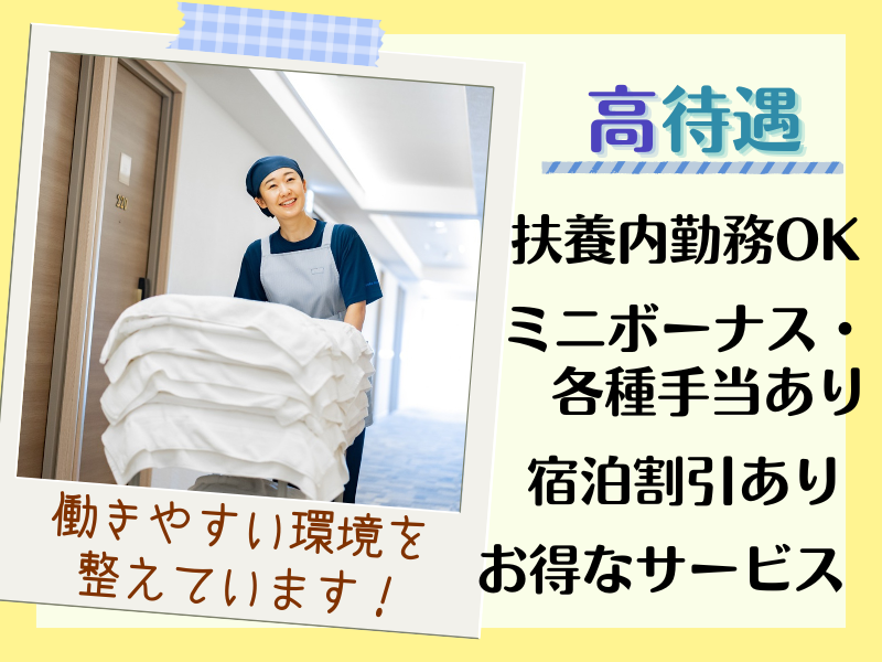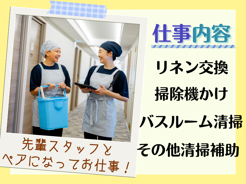 職場環境 \接客なし!/ チェックアウト後の客室清掃のため、 お客様の対応はなし! 人と話すのが苦手な方や、 黙々と働きたい方にもぴったりです◎ \幅広い年代のスタッフ活躍中!/ 作業は基本1人! 「人間関係が心配…」という方もご安心ください♪ 喫煙所:喫煙所あり(屋外)