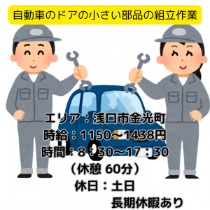 インフォメーション 日払い・週払いOK 土日休みでプライベートも充実できる♪ 【ビデオ通話での簡単登録始めました】 「must be (マストビー)だからこそ」 お仕事のご紹介特典いろいろ ・子育て主婦(夫)さんや自営業や シフトワーク、 Wワーク希望の方にもマッチした 勤務形態をご紹介。 ・フルタイム、パートタイム、時短勤務など のいろんな働き方の方々を応援! ・日払い、週払いOK!急な出費にも安心の お給与体制があります。(規定あり) ・来社は不要!出張登録OK! あなたのお住まいのお近くのカフェや 喫茶店で登録手続きができます♪ ・学歴不問、あなたのやる気を応援、 お仕事紹介でサポートいたします! ・学生さん、主婦(夫)さんから、 バリバリ稼ぎたい方、 まだまだ働き盛りの50代の方まで、 幅広い年齢層の方々が絶賛活躍中! アピールポイント ビデオ通話での簡単登録可能 must be(マストビー)では多種多様な職種を 取り揃えています。 どんな仕事を探しているかお気軽に お問合せ下さい! 1月は採用強化中! 1月中に応募いただいて 「1月中のスピード入社」はもちろん, 2月以降入社も随時相談承ります!