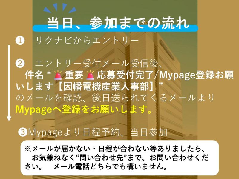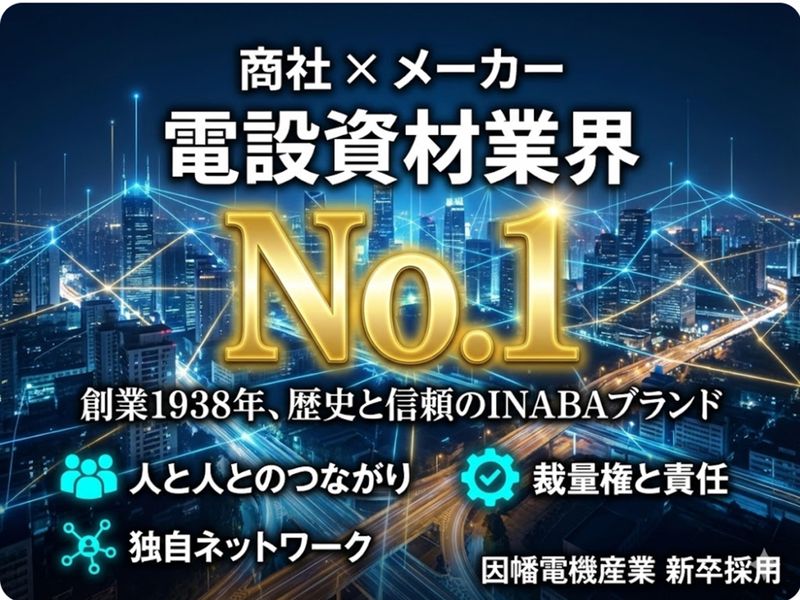 仕事内容 ✨この求人のポイント✨ ━━━━━━━━━━━━━━━━━━━ ✅ 電設資材業界トップの 「専門商社」であり「メーカー」 ✅ 街づくり(建設)と モノづくり(工場)の両方を支える ✅ 文理不問!知識ゼロから プロになれる充実の研修 ✅ 因幡電工ブランドの 「スリムダクト」「被服銅管」をはじめ トップシェア製品を保有 ✅ 安定基盤の上で、 若手から裁量を持って働ける ━━━━━━━━━━━━━━━━━━━ 【募集職種:総合職】 ━━━━━━━━━━━━━━━━━━━ (募集対象:大学卒、大学院了) ■営業職 ルート営業、セールスエンジニア 等 お客様の「困った」を解決し、 街や工場を動かす提案を行います。 他配属可能性あり職種 ■技術職 製品開発、生産技術 等 現場のニーズを 「売れる製品」として形にします。 ■事務職 経理、人事・総務、情報システム 等 会社の基盤を支え、 組織の成長をバックアップします。 ━━━━━━━━━━━━━━━━━━━ ✨仕事の面白さ✨ ━━━━━━━━━━━━━━━━━━━ この仕事の面白さは、 「安定した経営基盤」を背景に 「新たな挑戦ができる」ことです。 私たちは、電設資材業界トップシェアの 専門商社であると同時にトップシェア製品を 持つメーカーでもある技術商社です。 この「商社×メーカー」の独自性が、 他にはない面白さを生みます。 ◆商社として… 営業がお客様の「困った」 というリアルな声を掴み、 最適なソリューションを提案します。 あなたの提案で、 新しいランドマークに明かりが灯ります。 ◆メーカーとして… 技術職が現場の声を 「製品」として開発します。 あなたが携わった製品が、 快適な暮らしを守ります。 ━━━━━━━━━━━━━━━━━━━ ✨求める人物像✨ ━━━━━━━━━━━━━━━━━━━ ✅ 未経験から学ぶ意欲が強い方 ✅ 人の「困った」を放っておけない方 ✅ 信頼関係をじっくり築ける方 ━━━━━━━━━━━━━━━━━━━ ✨研修体制・フォロー✨ ━━━━━━━━━━━━━━━━━━━ 「文理不問」で プロになれる環境があります。 ▼新入社員研修 ビジネスマナーや会社のルール、 事業の基礎をしっかり習得 ▼商品知識研修(取引先企業での研修など) 実際に商品を手に取って触れ、 知識ゼロからプロフェッショナルを 目指していただきます ▼配属後のOJT 先輩社員がマンツーマンで、 一人ひとりの成長スピードに合わせて 丁寧に仕事を教えます 大切なのは、現時点での知識よりも 「挑戦したい」「貢献したい」 という姿勢です! ━━━━━━━━━━━━━━━━━━━ ✨説明会について✨ ━━━━━━━━━━━━━━━━━━━ 説明会では、「INABAのリアル」を 具体的にお伝えします。 「電設資材って、結局なに?」 「文系だけど、電機の知識ゼロでも大丈夫?」 「理系の専攻はどう活かせるの?」 「商社とメーカー、両方あるメリットは?」 業界No.1の「安定」と「挑戦」を、 ぜひ感じ取りに来てください。 ━━━━━━━━━━━━━━━━━━━ ✨応募・参加方法✨ ━━━━━━━━━━━━━━━━━━━ 【重要】 本求人に応募のみでは 予約完了となりませんのでご注意ください。 【STEP 1】 まずは応募画面からエントリー 【STEP 2】 エントリー後、マイページに関する ご案内メールが届きます。 件名:「重要 エントリーのお礼と今後のご案内/因幡電機産業(株)採用担当」 【STEP 3】 マイページにログインの上、 説明会のご希望日程をご予約ください。 ━━━━━━━━━━━━━━━━━━━ ✨因幡電機産業の強み✨ ━━━━━━━━━━━━━━━━━━━ く事業の3本柱> 1. 電設資材事業(商社) 業界トップシェア商社として、 ビル・商業施設・住宅に必要な 照明・空調・電線などを供給し、 街づくりを支えます。 2. 産業機器事業(商社) ロボットや制御機器を 組み合わせたシステム提案で、 工場の自動化(FA)を支えます。 3. 自社製品事業(メーカー) 空調関連部材でトップシェアの「スリムダクト」や、 防火区画貫通部材「タイカエックス」などを、 自分たちで開発・製造しています。 メーカーに縛られない独立系商社ならではの 豊富な商品力と社員の人柄が最大の武器であり、 お客様ごとの課題に即応したご提案が可能です。 ◇─◇─◇ 職種 ◇─◇─◇─ 総合職 (募集対象:大学卒、大学院了) 営業職/ルート営業、セールスエンジニア 等 技術職/製品開発、生産技術 等 事務職/経理、人事・総務、情報システム 等