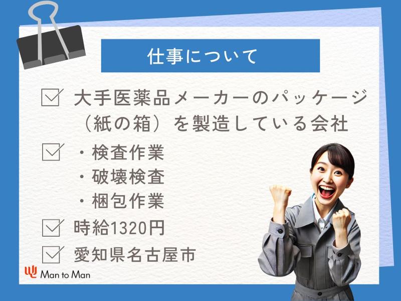 仕事内容: 【職種】 医薬品パッケージの梱包や検査 【仕事内容】 ◆大手医薬品メーカーのパッケージ(紙の箱)を 製造している会社でのお仕事です。 ★検査作業★ ・折りたたまれた状態で紙の箱が機械から出てきます。 ・片手分ぐらいをそこから取ります。 ・左右に振りながら、破れや折れをチェックします。 (※パラパラ漫画の要領で不良品を見つけます。) ・完成品を箱にしまって完了 ★破壊検査★ ・一定数(30-50枚)に対して一枚、糊付け部分を実際に剥がします。 ・糊の付き具合が多いか少なくないかを目で見てチェック。 ▽綺麗な製品を破くので意外とスッキリするかも ★梱包作業★ ・完成品を箱に詰めて出来上がり! ▽メルカリの要領でダンボール箱にセット 【安心ポイント】 ▽最初はそばに付いて、きちんと教えてくれます! ▽空調完備なので夏も冬も一定温度に保たれています。 ▽簡易クリーンルームなので花粉も少なく、花粉症の方も安心♪ ▽職場環境が綺麗!(やっぱり綺麗な職場が良いですよね!) ▽前職(コンビニやスーパーレジなど)工場未経験の方も活躍中です。 【慣れるまで】 ・商品点数が複数あるので覚えるまで1ヶ月ぐらい掛かります ・立ち作業になるので最初は足が疲れるかも ◎長く働きたい方必見◎ リーマンショックでも全く影響無し!直接雇用ももちろん有り! ◎しゅふ層の方必見◎ 子供の風邪や事業参観など、家庭都合のお休みも取りやすい職場です。 子育て世代の主婦さんが多数活躍中♪