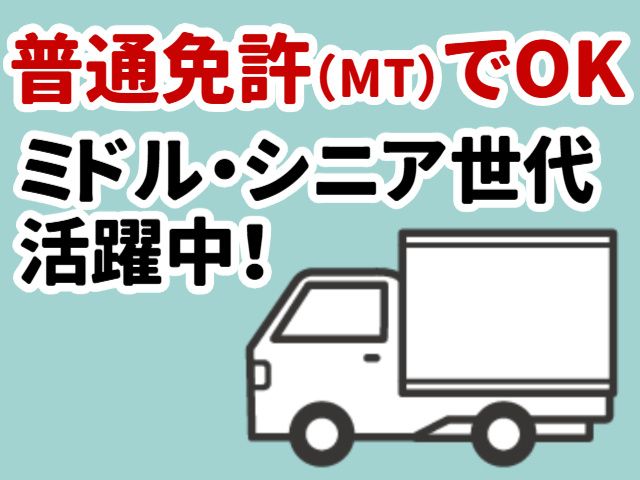 資格・経験 《 未経験・ブランクOK 》 ・普通自動車免許(マニュアル/MT車) ・配送経験不問 ・年齢不問