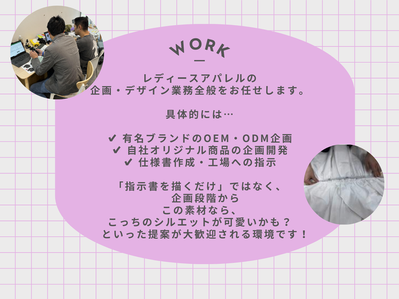 求めている人材 【必須条件】 以下3点を満たす方 ① 服飾系の学校を卒業された方 ② Illustrator・Photoshopが使える方 ③ 日本語での読み書き・会話がビジネスレベルで可能な方 (仕様書の作成や、細かいニュアンスの折衝が必要なため) 【ひとつでも当てはまればぜひ!】 ✨ 日本の「カワイイ」文化やトレンドに敏感な方 ✨ アパレル販売の経験があり、お客様の視点がわかる方 ✨ 自分のアイデアを形にしてみたい方 ★実務未経験や第二新卒の方も歓迎! スキルよりも「ファッションが好き」 「新しいことに挑戦したい」という気持ちを評価します。