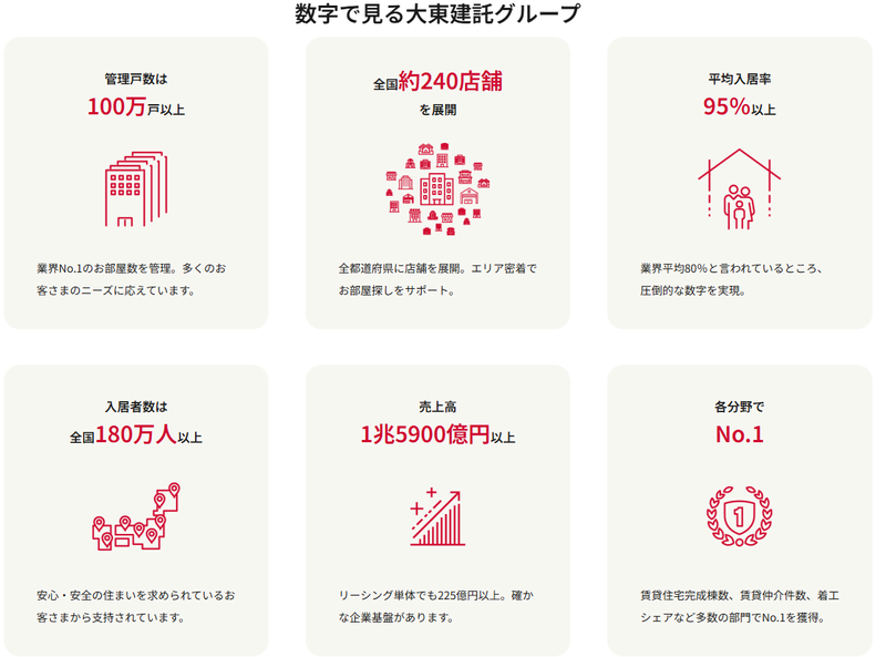 仕事内容 ◆年間休日125日 ◆未経験からでも安心な教育&サポート体制 ◆奨学金支援等、個性的な福利厚生充実! ◆シフト制だから私生活と仕事の両立が可能! ◆健康経営優良法人2025(ホワイト500) シフト制で自分の都合に合わせて働くことができます! 人の役に立ちたい! という思考の方にはバッチリ! 年間仲介実績日本No1の集客力で、 多くのお客様に役に立てます。 ======================= 大東建託リーシングとは ======================= 「いい部屋ネット」でお馴染みの 大東建託グループは、 独自の「賃貸経営受託システム」によって、 オーナー様の土地の有効活用を支援する、 東証プライム上場企業の 大東建託を中心としたグループです。 管理戸数100万戸、 数多くの分野で業界No.1を誇っています。 ======================= 仕事内容 ======================= 賃貸物件を探しているお客様に、 お部屋のご案内~契約手続きを担当していただきます。 ・ご希望条件などのヒアリング ・物件のセレクト、ご紹介 ・気になる物件があれば現地へご案内(内見対応) ・ご契約の手続き ・物件のお引渡し 【20~30代活躍中/未経験から始められます!】 未経験OK・経験不問なので不動産業界にチャレンジしたい方や、大手企業で働いてみたい方など幅広く受付中!アパレルや飲食店、小売業、家電量販店などの販売・接客経験や、保険営業(生命保険や、保険アドバイザー、保険の窓口スタッフ)などの経験があると仕事の流れが掴みやすく、すぐに慣れることができると思います。もちろん不動産仲介営業の経験者や、宅地建物取引士(宅建)の資格をお持ちの方も大歓迎です! 【研修体制について】 店舗配属後はメンター制度で先輩営業スタッフが専任であなたを育成します!また、各店舗ともチーム体制を重視しているので、一人で誰にも相談できないといったことは一切ありません! 【当社について】 安心して長く働いていただけるよう、充実の待遇や休暇制度をご用意。私生活・仕事、共にサポートします。昇給や年2回の賞与であなたの頑張りを給与として還元!普段のお休みのほか、長期休暇やリフレッシュ休暇でしっかり休むことができるので、メリハリのある働き方が可能です。お休みの社員のフォロー体制をしっかり整えているので、安心して有休を取得できます!
