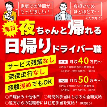 要中型免許!日帰り輸送で毎日家に帰れる!月収30~40万円も可/資格取得支援制度もあり