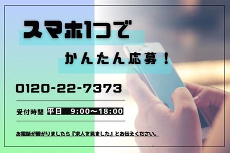 選考プロセス 面接(約30分) ※ご希望に合わせて電話面接もOK! ↓ 工場見学(約1時間) 実際に働いて頂く職場を自分の目で確認! ※工場最寄り駅から送迎、もしくは現地集合 ↓ 入社手続き(約1時間) 書類記入や入社前教育を行います ↓ ★入社★ 最短で1~1.5週間で入社が可能です。 入社日の調整も可能!面接時にご相談ください♪ 【問合せ先について】 問合せ先:0120-227-373 【お電話での応募はこちら】 0120-22-7373 応募受付センター (受付時間:平日9時~18時) 求人番号:ta-12163318 応募方法 応募するボタンをクリック ↓ 3営業日以内に弊社からメッセージまたは電話にて ご連絡をさせて頂きます。 メッセージのチェックをお忘れなく(*^^)v ※応募多数の場合は書類選考の可能性あり