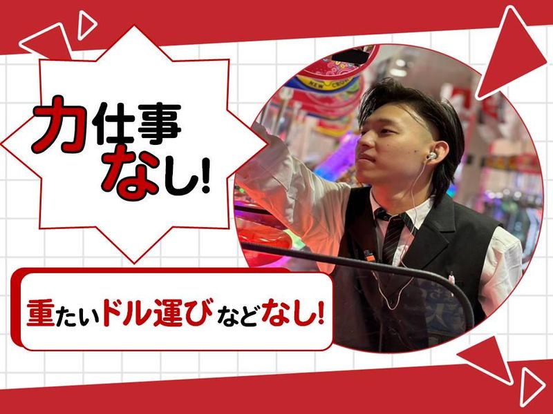 仕事内容 【20代~30代の若手中心に活躍中!】 ホール・カウンターでの接客業務が中心です。 研修が充実しているので未経験の方も 安心してスタートできます! 最新のシステムを導入しているので 重たい作業や難しい業務も一切ありません。 パチンコの知識がなくても大丈夫です(*^^) マニュアルも完備しているので、 わからないことはすぐに確認できます! ✅玉運びナシ!なので身体の負担最小限 ✅接客重視で接遇/マナーが身につく …………………………………………………… / ⭐ここがPoint!⭐ \ ・職場は明るく常にワイワイしています♪ ・全員が20代♪賢く稼いで、当社の仕事だけで生計を立てられます♪ ・昇給制度があり、頑張りを還元! ・アルバイト、パートから社員登用制度で 正社員になることも可能です! ・ネイルやヘアカラー自由!おしゃれOK! ・風通しの良さは抜群!店長との距離も近く、気軽に意見を伝えられる環境です。 ・15時からのゆったり勤務!早起きが苦手な方にもオススメ◎ ……………………………………………………