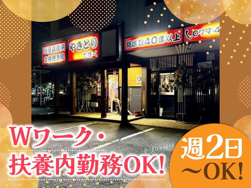 仕事内容 ✅ 女性活躍中!雰囲気◎の焼き鳥居酒屋 ✅ 調理経験者は能力に応じて昇給あり! ✅ 夕方からのシフト募集◎ ✅ 臭いが気にならないガス焼き♪ ✅ 週2日~、Wワーク・扶養内勤務OK! ✅ 派手過ぎなければ…ネイルOK! 【具体的なお仕事】 ・焼鳥の焼き手や簡単な調理等をお任せ! →レシピ完備!手順通りにすれば誰でも簡単に焼けます◎ ・慣れてくれば包丁を使ってもも肉を切ったりなどもお願いします。 ・その他、一部ホール業務など ⭐当店はガス焼きなので、炭火焼き特有の臭いがつく心配は無し! オシャレ好きな方も安心して勤務できます! (制服も貸与します) 今回は、夕方シフトの募集! (※ランチシフトも募集しております) 空き時間を使って働けるので、お子さんの送り迎えの間や、子育てが落ち着いた方にもピッタリな職場です! ◇インスタにてお店の雰囲気も投稿中♪ https://www.instagram.com/taboku_yakitori/ - お店の紹介 - 有名焼き鳥居酒屋の常連だった現店長が、 縁あってお店を引き継ぎ、オープンしました! 店長が女性な事もあり、主婦さんや学生さんなど多くの女性スタッフが活躍中! 女性・主婦さんならではの悩みにもしっかり寄り添います! シフトは一人ひとりの希望を聞きながら組んでいきます!