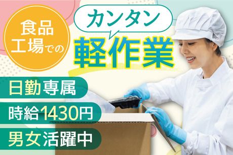 仕事内容 【アピールポイント】 ●短期集中で稼ぐならココ!1ヶ月限定ワーク! ●週休2日でゆったり♪日勤×1430円の好条件♪ ●大量10名以上採用!友達や家族と一緒に応募OK ●初めてでも即できる♪食品工場のラクラク作業 【仕事内容】 大手食品工場でフランクフルトの製造補助 <製造工程> フランクフルトに串を刺す機械のサポート ・完成したフランクフルトを機械に入れる ・流れてくるフランクフルトの向きを変える ※串は機械が刺すので不器用でも大丈夫! <包装工程> ・シールの目視検査 ・機械への原料投入 どれもカンタンな作業ばかりなので 未経験&ブランクのある方も大歓迎です☆ 【期間限定のお仕事☆】 \短期でサクッと稼ぐならコレ!/ 1ヶ月だけの集中ワークで、 「つなぎ」や「お小遣い稼ぎ」にもピッタリ♪ 毎年人気の短期案件で、 今年も10名以上の大量採用! リピーターさん続出の職場なので、 初めての方でも安心してスタートできます。 短期間で効率よく稼ぎたい方におすすめのお仕事です★ 【職場について】 誰もが知る人気商品をつくる大手食品メーカー工場! 「一度は食べたことある!」 扱うのは知名度抜群の身近な商品ばかりです☆ 20代~60代前半まで、幅広い年代の男女が活躍中! ミドルさんもシニアさんも大歓迎です♪ 家族や友だちと応募OK&入社日の相談もお気軽に◎