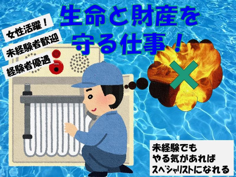 仕事内容 \\✨未経験者歓迎!✨// 火災発生時に、私たちの生命と財産を守るのが消火器や誘導灯などの「消防設備」です。 それら消防設備が、いつでも確実に作動するよう点検するのが私たちの仕事! ◎業務内容 ✅点検業務(未経験の方はこちらから!) ✅メンテナンス ✅改修・修繕⼯事 ====== POINT ====== ⭐創業50年以上!安定して働けます ⭐昇給・賞与あり!交通費も全額支給 ⭐週休二日制&長期休暇あり! ⭐建物がある限りなくならないお仕事 ⭐案件増加につき事業成長性も◎ ⭐未経験から、PROになれる業種です ⭐作業は屋内◎難しいことはないです ⭐仕事に「使命感」あります! ★・・・・・・・・・主な業務内容・・・・・・・・・・・・・★ 【消防設備点検のフロー】※未経験者はこちらから! ┗事前に点検のお知らせ ┗消防設備の点検 ┗報告書の作成 ┗消防署に報告 【点検に付随した仕事】※資格の所持者 ┗点検の不具合箇所の見積・修繕工事 ┗老朽化した設備の改修 ☆経験・資格により給与考慮します。 【その他】 ┗消防訓練のサポート ★・・・・・・・・・・・・・・・・・・・・・・・・・・・・・・・・・・★ \✨ミッション=人々の命を守る✨/ 消防設備の点検では、建物や施設に設置された消防設備が非常時にきちんと作動するかどうか確認し安心安全をお届けしています。 ⾮常事態が発⽣した際には⼈々の命を守ることがミッションです。 業務内容は単純な点検作業ですが、その一つ一つが人々の安全に直結する重要な作業です。 使命感を持って業務に取り組む姿勢や努力が、安心して生活できる社会を築くことに繋がります。 \✨「ありがとう」がやりがいに✨/ 点検が無事に終了し「異常ありません」と報告できた際にはお客様から「ありがとう」と直接感謝の言葉をいただくこともあります。 日々の業務を通じて多くのやりがいや「いざという時に誰かを守れている」という達成感を感じることができますよ♪ \✨チームで動く✨/未経験でも大丈夫! 消防設備は、消⽕器・⽕災報知設備・スプリンクラー・避難ハッチ・誘導灯 などなど多岐にわたりますが…最初は、消火器の点検から! 一つ一つ、「出来る」を増やしていければ大丈夫です。基本的に、チームで作業いたしますので未経験でも安⼼して働けます◎ 未経験者でも「やる気」がある方はPROとして、手に職をつけることができます。 また、経験者の⽅や⼯事をしたい⽅にはより専⾨的な業務にも携わっていただくことが可能です。 \✨いろんな建物に✨/長く続けられる仕事! 消防設備点検は6カ月に1回サイクル。基本的に、毎日、違う建物を点検していきますが、入社後6カ月で2サイクル目に入ります。 2サイクル目にはいると、1サイクル目に点検を行ったことを自分でも思い出しながら作業を行います。 1回目は言われたことだけやっていた自分が、2回目の点検を行う際は、何をしなければ成らないのか考えながら動けるようになっています。 日々、いろんな建物に訪れ、点検を行い、飽きることなく長く続けることができる仕事です。