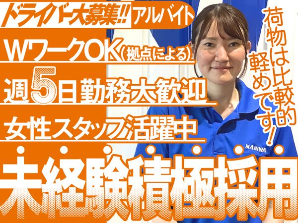 仕事内容 〜当社で働くオススメPOINT〜 ️アパレル商品なので軽量 ️夜勤なし ️週3~勤務OK ️履歴書不要で即面接OK! 中型トラックを使いながら、柏市内に衣服や雑貨などのアパレル商品の配送・配達やお客様の物流倉庫から荷物を集荷したりするお仕事です。 フォークリフトなどの資格も必要なく、未経験者の方も大歓迎のお仕事です。 また、荷物が非常に軽量なので、女性ドライバー(トラガール)を目指す方にもおすすめです。 週3日~の勤務が可能でお仕事も日帰りなので、プライベートも充実。 Wワーク・副業を希望する方も大歓迎です。 ============= こまで読んでいただき、興味を持っていただいた方は弊社採用センターまでお気軽にお電話ください。 お電話の際は仕事番号「16の18」とお伝えください。 浪速運送採用センター/0120-070-728 (平日9:00~18:00受付、それ以降は大変お手数ですが、Webからお願いいたします)