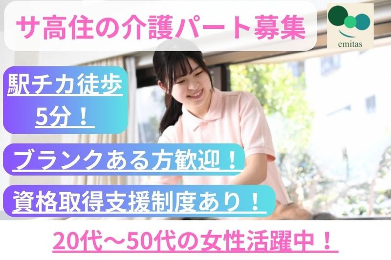 【アピールポイント】 サービス付き高齢者住宅の介護パートスタッフ募集! ■資格取得支援制度あり! ■20代~50代の女性活躍中! ■ブランクある方歓迎! ■駅チカ徒歩5分!