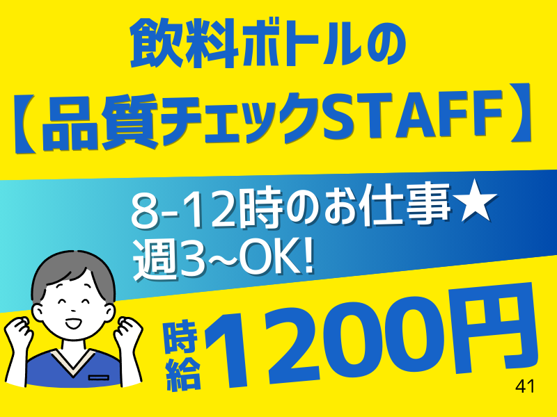 仕事内容 <ここがおすすめポイント> ✨未経験者歓迎!特別なスキルは不要♪ ✨シンプル作業で覚えやすい! ✨30~50代の男女スタッフ活躍中! ✨ライフスタイルに合わせて働ける! 家事や育児との両立も可能◎ - <仕事内容> 飲料ボトルの品質チェック業務を お任せします。 <具体的には> パレットに積まれている飲料ボトルを 目視で検査。キズや汚れ、異物の混入が ないかを確認するお仕事です。 モクモク作業が好きな方にオススメ! お仕事は、超簡単シンプル作業! 1日で覚えることができますので 安心してくださいね◎ 「軽作業は初めて…」という方も大丈夫 先輩スタッフが丁寧にサポートします。 - <週3~、お昼に終わるお仕事> 週3日~OK、12時には終わります。 家事や育児との両立もバッチリです。 「扶養内で働きたい」 「子どもが学校に行っている間だけ」 「スキマ時間を有効活用したい」 「Wワークで効率よく稼ぎたい」 という方にピッタリな職場です。 30~50代の男女スタッフ活躍中! - / リフト免許お持ちの方は時給UP! \ <色々な所から通っています♪> 名古屋市、小牧市、春日井市、岐阜県、 各務原市、多治見市、北名古屋、 美濃加茂市、みよし市から通っている 方多数!もちろん車通勤OKです◎ 雇用形態:アルバイトパート