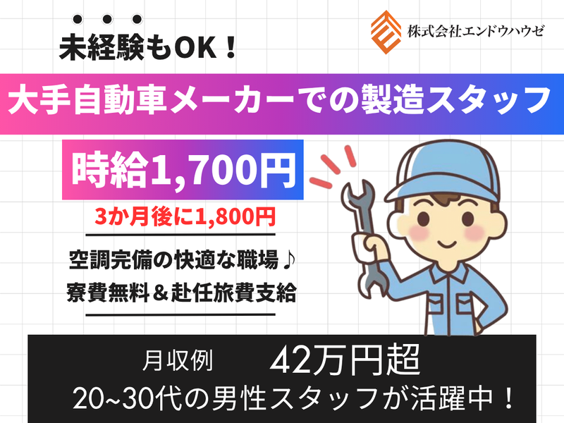仕事内容 ★この仕事のポイント★ ✅ 高時給1,700円スタート/3ヶ月後1,800円へ昇給 ✅ 月収42万円以上も可(残業・深夜・休出含む) ✅ 寮費無料&赴任旅費支給 → 遠方からも歓迎! ✅ 未経験OK/充実の研修制度あり ✅ 6ヶ月毎にボーナス支給あり(最大12万円) ✅ リモート面接対応可/スマホで完結 ✅ 土日休み+長期休暇ありでプライベートも充実 ✅ 定着率が高く、職場の雰囲気◎ ★仕事内容★ \世界的メーカーで安定勤務/ 最新車種の製造に関わるやりがいのある仕事です。 【配属先(希望考慮)】 ◆車体組立: ・フレームに部品を取り付けるライン作業 ・電動工具を使ったボルト・ネジ締め ・ドア・シートなどのパーツ装着 ◆トランスミッション組立: ・駆動部品の組付け、取り付け ・締付け作業(トルク管理あり) ・細かな部品の取り扱い中心 作業はチーム制で分担し、無理なく進められる環境です。 ★活躍中のスタッフの声★ 「最初は体がキツく感じましたが、2ヶ月もすれば慣れました。 収入は文句なしですし、寮も快適。職場の雰囲気もいいので長く続けられそうです。」
