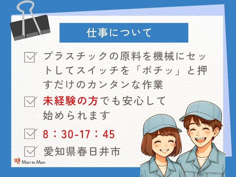 仕事内容: 【職種】 プラスチック製品の機械加工オペレーター 【仕事内容】 「土日祝休みで、高蔵寺付近で働きたい!」 そんな方におすすめの プライベートを充実させやすいお仕事です♪ 【具体的なお仕事】 ☆機械加工(オペレーター)のお仕事 完成形は、「バルブ」という 手のひらサイズのプラ製品! プラスチックの原料を機械にセットして スイッチを「ポチッ」と押すだけの カンタンな作業です。 安心ポイント1: 未経験から始める方でも 職場の正社員さんに丁寧に教えてもらえます♪ ★弊社からのスタッフも、 未経験スタートかつ女性で 活躍している方が沢山います! 【入社後のイメージ】 最初はシンプルな作業から、ゆっくり丁寧に コツコツ取り組めればOK! ☆コンベアや、次の人に渡していく作業はありません。 「ライン作業なし」なので、安心♪ 目安としては、最初の1~3ヶ月は作業を覚えていく期間。 入社3~4か月後に、一通りの作業をスムーズにできるようになっているイメージです♪ ☆将来的には正社員を目指せる職場です。 弊社スタッフが正社員になった実績もあります♪ 【職場の特徴】 ・モクモク作業多めなので続けやすい! 基本、指示書を見ながら もくもくと繰り返す作業です。 ・丁寧な職場で、40年続く安定企業♪ 入社当日は、安全教育から。 現場に配属されたら、指導担当の方から 丁寧に作業を教えてもらいます。 ・高蔵寺駅から送迎バスあり 行き帰りを快適に送ってくれる送迎バスがあります。 駅の近くに住んでいる方もラクラクですね♪ ★職場の見学ももちろんOK! 「どんな職場だろう?」と気になる方は ぜひ、弊社の担当と見学に行きましょう♪ 専任担当が、見学から入社後までサポートするので、ご安心ください! 少しでも気になった方は、ぜひお気軽にご応募ください♪