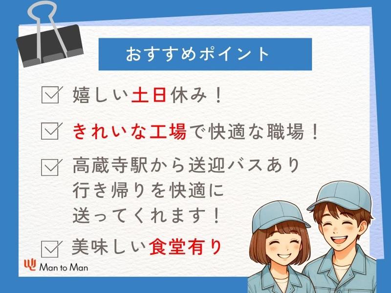 求める人材: 【応募資格】 未経験OK! 資格不問です。 特別な知識・スキルは一切不要です。 Man to Manでは他にも以下の様なスタッフさんが活躍されています。 ・正社員を目指す方。 ・派遣社員としてスキルを磨きたい方。 ・ママさん、パパさん ・アルバイト/パートからの転身の方。 ・短時間勤務からフルタイムに切り替えたい方。 ・工場でのお仕事に興味がある方 ・製造業にチャレンジしたい方。 ・学歴不問の職場で働きたい方。 ・介護をしながら働きたい方 仕事に対してこんなお悩みありませんか? ・男性、女性だからこそ活躍できる職場で働きたい。 ・20代、30代、40代、50代活躍中の職場で働きたい。 ・日勤の固定勤務で働きたい。 ・土日祝休みの職場で働きたい。 ・交通費支給の職場で働きたい。 ・寮に住み込みで働きたい。 Man to Manには、 ハローワークや一般求人誌には掲載されていないお仕事情報もたくさんありますので、 まずはお気軽にお問合せください。