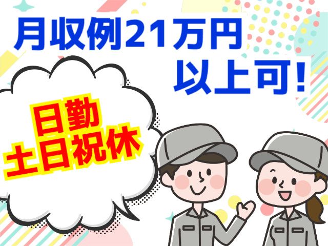 仕事内容 <注目ポイント> ・土日休み&長期休み ・月収例21万円以上可 ・空調完備で快適環境 ・正社員登用有 ・人気の日勤 <お仕事詳細> ナットやボルトのネジ締め軽作業 組み立てるものは、配電盤などになります。 ・スパナなどで部品を組み立てる ・ニッパなどで配線を取り付ける 難しそうに見えますが、作業は非常に単純です 工場での勤務経験や、組立、製造のお仕事が未経験でも大丈夫! 育成環境が整っているので、安心してお仕事スタートできます。 <充実のお休み> 土日祝お休みで働きやすい! 夏期、冬期休暇などの長期休暇もあります。 ご家族やご友人との予定も立てやすい! <しっかり稼げる> 日勤 1,200円×7.83h×20日=187,920円 残業 1,500円×20h=30,000円 月収例21万円以上も可! <職場環境について> ・空調完備でいつでも快適 ・駐車場が近い ・工場内喫煙スペース有 <キャリアアップも目指せる> 正社員登用の可能性有! ゆくゆくはキャリアアップを 目指したい方にもおすすめ! 収入アップしたいフリーターの方、 日勤で働きたい主婦(夫)の方、 体に無理なく働きたいミドル世代の方、 おすすめのお仕事です! パート・アルバイトからの転職もOK! 現在20代~40代の男女活躍中です。 電気を供給する為に欠かせない 「配電盤」を長年にわたり提供してきた 実績のある会社で、 落ち着いてお仕事できる環境です。 興味がある方ぜひお気軽にお問合せください。