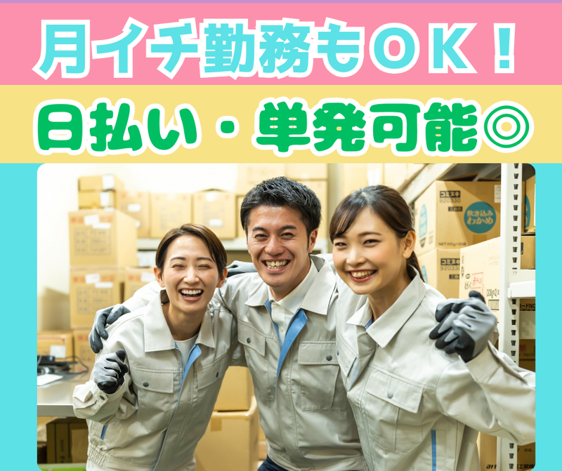 仕事内容 \ Wワークのフリーターさん多数活躍中♪ / ☆+..+☆+..+☆+..+☆+..+☆+..+☆ *シフト自由がうれしい! *働いた分の給与は翌日払いOK! *派遣なのに年2回ボーナス支給あり! *髪型・髪色・服装・ピアスぜんぶ自由! *履歴書不要で即面接・即採用OK! ☆+..+☆+..+☆+..+☆+..+☆+..+☆ 【仕事内容】 大山崎エリアの物流センターにて、お菓子の入出荷作業をお任せします。 扱うのは身近な「お菓子」ばかり。重たい荷物は少なめで、体への負担も軽めです! 勤務地:大山崎町 ~具体的には~ *リストを見て商品を集める(ピッキング) *数のチェック(検品) *出荷用ダンボールへの箱詰め・仕分け など ◎まずは業務の流れなどイチから丁寧にお教えします♪ ◎フリーターさんが多数活躍中! 「レギュラーワーク」も「かけもちバイト」も、あなたのスタイルに合わせて働けます。 「急な出費が…」という時も安心!稼働分の給与を翌日に受け取れる日払い制度があります(週払いもOK!) ★月1回だけの単発OK!自由シフト♪  ̄ ̄ ̄ ̄ ̄ ̄ ̄ ̄ ̄ ̄ ̄ ̄ ̄ ̄ ̄ ̄ ̄ 「今週はライブがあるから週0日」「来月は旅行資金を稼ぎたいから週5日」など、シフトは超自由!水曜日に翌週のシフトを出すだけなので、プライベートの予定も立てやすいのが魅力です! ★通勤ラクラク!  ̄ ̄ ̄ ̄ ̄ ̄ ̄ ̄ ̄ ̄ ̄ ̄ ̄ ̄ 香里園(事務所)から無料送迎バスが出ています!バイクでの直行直帰もOK! 地元の方はもちろん、少し離れたエリアからも通いやすい職場です♪