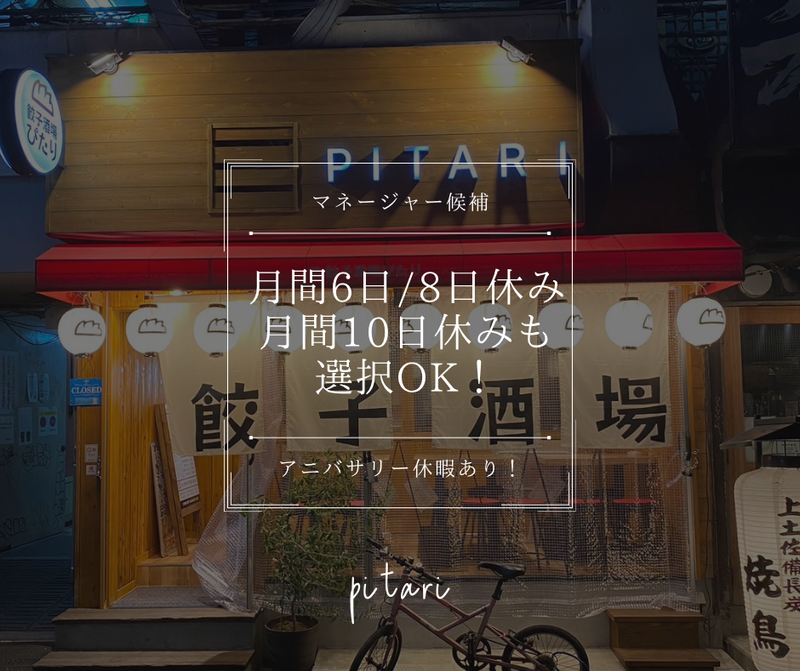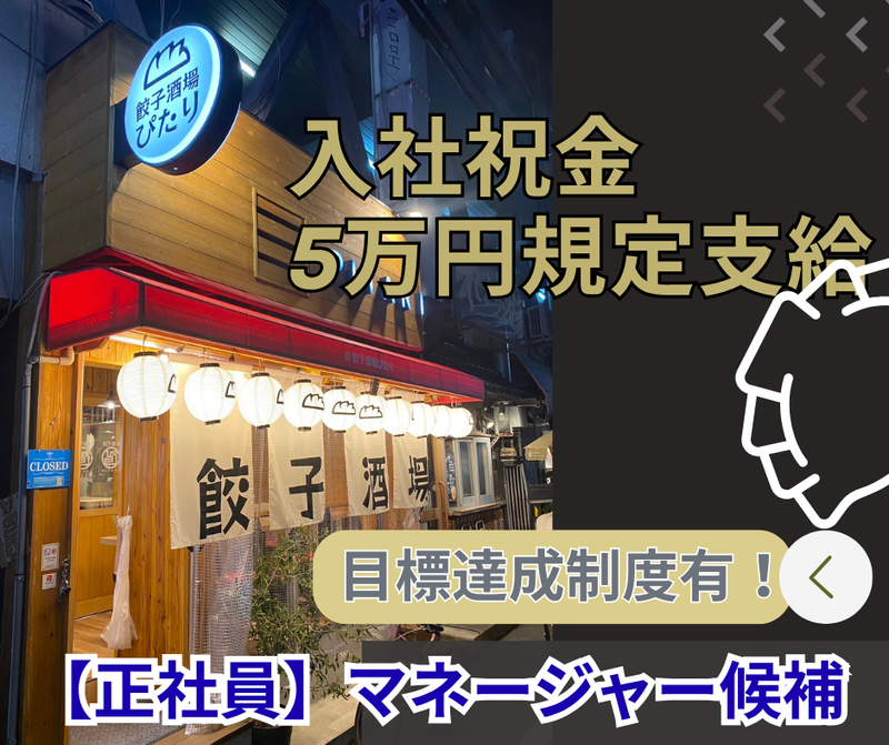 求めている人材 店長職として活躍頂ける方を求めています! 飲食業界経験者の方を特に求めています! ・フリーター・主婦(夫)大歓迎! ・これまでに接客や飲食店での経験をお持ちの方は特に大歓迎! ・経験が浅い方などは、早期に店長職として活躍して頂けるように しっかりと細かな部分までトレーニングしていきますので 是非、一緒に成長していきましょう! 【あなたの入社で!】 おかげ様で新コンセプト店としてスタートした「餃子酒場 ぴたり」の業態は 多くのお客様にファンとしてご利用頂いている人気店! そんな背景から、新規店舗をスグにでもオープンさせる計画が有ります。 ですが、新規店舗や既存の繁盛店を運営頂く店長が不足している現状が有ります。 ですから、あなたが入社し店長として活躍頂ければ、新たな新規店舗をオープンする予定です! あなたの応募を熱望します!