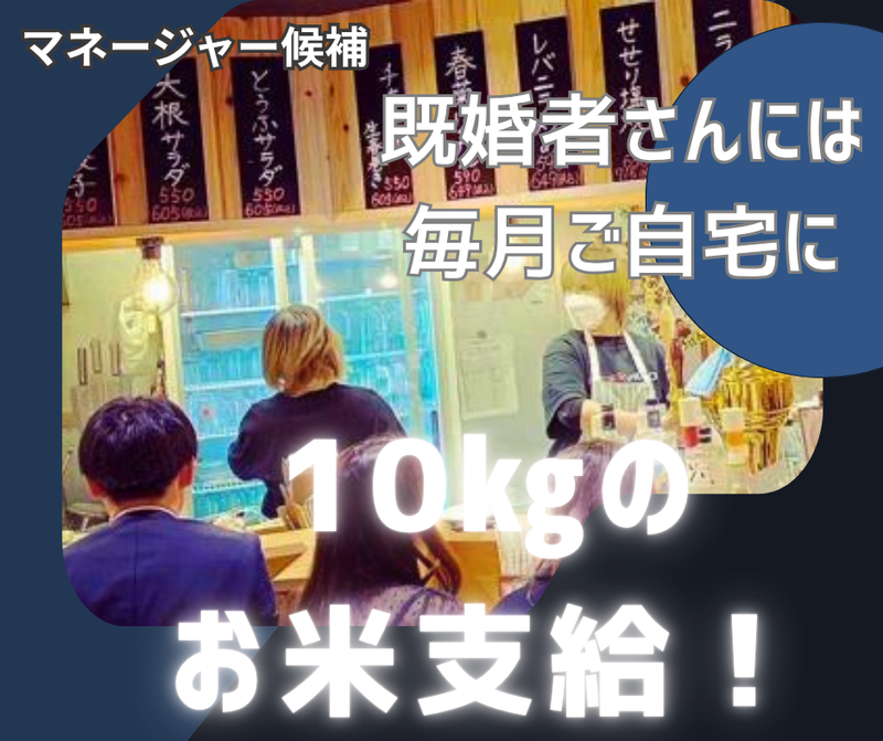 職場環境 餃子居酒屋で、活気ある雰囲気の中で一緒に働くことができます。 大学生やフリーターなど、幅広い年齢層のスタッフが活躍していますので、 就活などの相談や悩み事などにも耳を傾けてあげてください。 ・入社祝金5万円支給や既婚者は毎月お米10Kgが自宅の届く待遇有! 喫煙所:喫煙所あり(屋内) 分煙になっております。