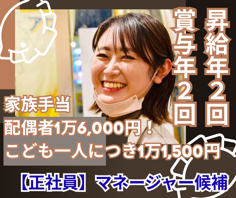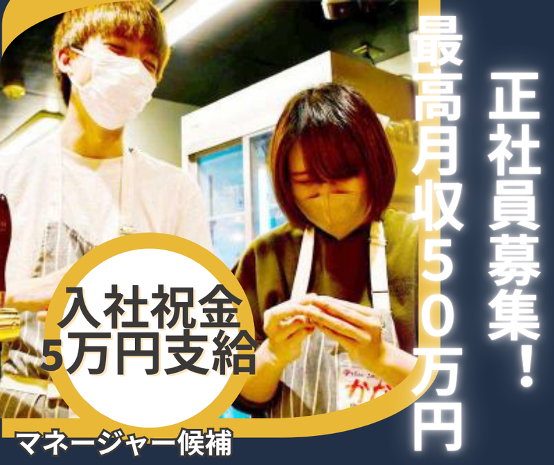 仕事内容 【お仕事内容】 早期にマネージャーとして活躍頂こうと考えています! 数店舗の店舗運営全般とアルバイト、パートの勤怠管理なども大切なお仕事! あなたの能力を十分に発揮して頂けるステージが有ります! 1)マネージャーとして、店舗運営全般をお任せします。 2)マネージャーとして、スタッフ管理もお願いします。 3)食材などの仕入れの発注方法などもお任せしていきます。 4)店長の良きサポーターとして、さらなる繁盛店を目指していきます。 あなたの能力を十分に発揮して頂けるステージが有ります! 【アピールポイント】 入社祝金5万円支給(規定有) 幹部候補スタッフを迎えるに当たって、充実した待遇をご用意してます! 配偶者も喜ぶ少し変わったお米10kg支給有り! ・まずは、安定した月給であなたをスカウトします! 頑張りも収入で還元!目標達成制度有! シフト制で月間6日のお休み! 月間8日のお休みか10日のお休み選択もOK! 【新コンセプトで登場したお店】 おかげ様で連日大盛況! なので、店舗運営スタッフを大募集!! スタッフのみなさんが、仕事とプライベートを上手く調整できるように 増員募集でみなさんのシフトを柔軟に対応中! 「稼げる!」「楽しく!」「自分の働きやすい時間で!」 スタッフみんなが、働きやすい環境を整え中です! 【仲間って?】 業界経験者さんやフリーターから正社員を目指したい方! アルバイトスタッフには学業と上手く両立しながら、 バイトをする男子学生や女子学生さん! 時間を有効活用しながら家計の足しにしている主婦さん! 趣味の時間を作りながら、ガッツリ稼ぐフリーターさん! 20~30代の男女スタッフたちが活躍中の楽しいお店です! 【会社概要】 株式会社ケイビーフーズ 創業/2006年 資本金/3,000万円 従業員数/397名(アルバイト・パート含む) 事業内容/各種飲食店の経営・各種飲食店の運営業務請負 ホームページ/https://kbgroup.jp/
