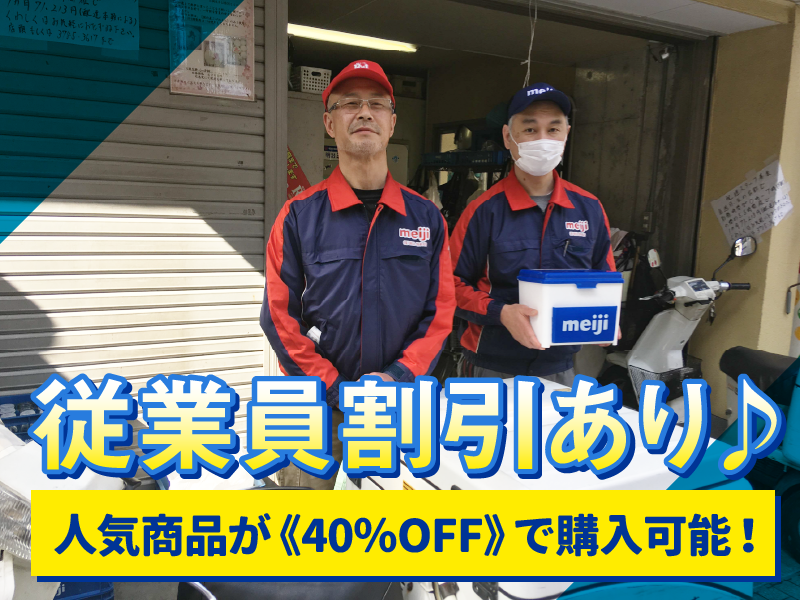 仕事内容 【雇用形態】アルバイト 【職種】牛乳配達スタッフ \このお仕事のポイント!/ ✅時給1600円! ✅1日4時間~の短時間勤務可◎ ✅原付免許があればOK♪ ✅社員割引制度あり! 商品が40%OFFでお得に購入 ・・・・・・・・・・・・・・・・・・・・ 《詳しい仕事内容》 明治製品をバイクに詰め込み、 お客様の明治宅配BOXに お届けするお仕事! 基本的にお客様との会話はほとんどなく、 深夜勤務なので、渋滞の心配もありません♪ ルート配送なので、 同じお客様先に訪問するだけ! 道も覚えやすいですよ♪ 慣れればサクサク進めていけます。 ・・・・・・・・・・・・・・・・・・・・ 《週2日、1日4時間~OK》 日中の時間も有効に使えるので、 家事や育児、学業、趣味、副業やWワーク などとの両立も可能です! 働きやすい環境が整っているので、 長期で働きたい方も必見です! 【勤務パターン】 勤務は週2日 └月曜・金曜 ・・・・・・・・・・・・・・・・・・・・ 《正社員や先輩がしっかりサポート》 現在は30代~70代までの幅広い年代が 活躍しています♪ 配達・配送や運転のコツなどは、 先輩がしっかりとフォローするので安心! 牛乳配達未経験の方でも 始めやすい環境です! ・・・・・・・・・・・・・・・・・・・・