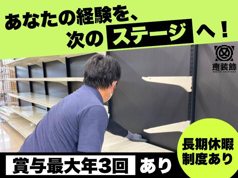仕事内容 ✨未経験からスタートがほとんど! ✨経験・スキルは一切不要! ✨スタッフの8割以上が未経験で活躍中! ✨賞与は最大年3回!20代で年収420万円以上も◎ ✨人柄重視のあたたかい職場!社員旅行・レクリエーションあり! 【仕事内容】 お店づくりの“仕上げ役”として活躍する仕事です! 《具体的には》 100円ショップやアパレル店など、 身近なお店に並ぶ陳列棚(ゴンドラ・ラック什器)を ・組立 ・レベル調整 ・パーツ取り付け など 行っていきます。 全国多数に現場はございますが、 作業はシンプルで、 2〜4名のチームで協力しながら、より快適な売場を作ります! ※大きい材料や仕上物は 周囲に気を遣いながら作業します! ※高所作業時は必ずヘルメット・安全帯を使用して、 安全作業を心がけます! ■□■ ここがイチオシ! ■□■  ̄ ̄ ̄ ̄ ̄ ̄ ̄ ̄ ̄ ̄ ̄ ̄ ̄ ̄ ̄ ̄ 【◆"日常の舞台"を創るお仕事!】  ̄ ̄ ̄ ̄ ̄ ̄ ̄ ̄ ̄ ̄ ̄ ̄ ̄ ̄ ̄ ̄ 大阪市内を中心に、関西一円の商業施設が現場です! 生活に身近な“あのお店”を形にしていく実感が得られます。 未経験でも、 工具の名前を覚えるところから始め、 現場はチーム作業なので、必ず先輩がサポートします! 経験積み重ねて、スキルが伸びていく環境です! 完成後、普段利用するお店に 「自分が組み立てた棚が並んでいる」 そんな実感を味わえるのが、この仕事ならではです◎ 【◆手厚い待遇と働きやすい職場環境で安心!】  ̄ ̄ ̄ ̄ ̄ ̄ ̄ ̄ ̄ ̄ ̄ ̄ ̄ ̄ ̄ ̄ ̄ ̄ ̄ ̄ ̄ ̄ 賞与は最大年3回! 今なら入社お祝い金10万円支給◎ 各種手当も、皆勤・技能は一律として 家族・住宅・出張・現場手当 etc. 様々な手当で毎月の収入も安定! 頑張りがしっかり給与や手当に反映されるので、 やりがいも抜群! 社内レクリエーションや年1回の社員旅行もあり 社員から好評です◎ 年間休日は100日以上! 夏季・年末年始と長期休暇も取得可能◎ 慶弔休暇、産前産後休暇、育児休暇も◎ ライフイベントにも柔軟に対応できるので、 働きやすい環境です! 【◆株式会社恵装飾ってどんな会社?】  ̄ ̄ ̄ ̄ ̄ ̄ ̄ ̄ ̄ ̄ ̄ ̄ ̄ ̄ ̄ ̄ ̄ ̄ 株式会社恵装飾は.... 2017年、2名からスタートしました。 「社会を通して正しく思考し行動する」 「日々の出来事に感謝する」 「日々を安全に終える」 という3つの価値観を大切に 1つ1つの仕事を丁寧に行って お客様からの信頼を獲得。 現在は大阪本社の他、 名古屋、埼玉にも拠点が御座います。 また来春には、 東京営業所を開設予定となり、 関東や東北など全国を回って 働くこともできます! 【◆従業員インタビュー!】 <◇Oさん> ▼良かったこと難しかったこと/やりがい  ̄ ̄ ̄ ̄ ̄ ̄ ̄ ̄ ̄ ̄ ̄ ̄ ̄ ̄ ̄ ̄ ̄ ̄ ̄ 仕事を通じて様々な人たちと交流できることが楽しいです。 毎日が新鮮で、刺激的な現場を楽しんでいます。 一方で、自分の覚えが少し遅いと感じることがありましたが 「塵も積もれば山となる」という座右の銘を胸に、 日々コツコツと努力し、少しずつ成果を出しています。 <◇Kさん> ▼良かったこと難しかったこと/やりがい  ̄ ̄ ̄ ̄ ̄ ̄ ̄ ̄ ̄ ̄ ̄ ̄ ̄ ̄ ̄ ̄ ̄ ̄ ̄ 私が仕事で一番楽しいと感じるのは、 仲間と連携をとりながら仕事が進んでいる瞬間です。 そういう時だからこそ、 チームとしての力を感じられますし、 一体感を得られるのが嬉しいです。 自分の手がけた仕事が、実際に多くの人たちの目に触れ、 楽しんでもらえることは本当に嬉しいです。 また、当社の社内イベントは非常に充実しており、 毎回楽しみにしています。 これも一つのやりがいだと感じています。