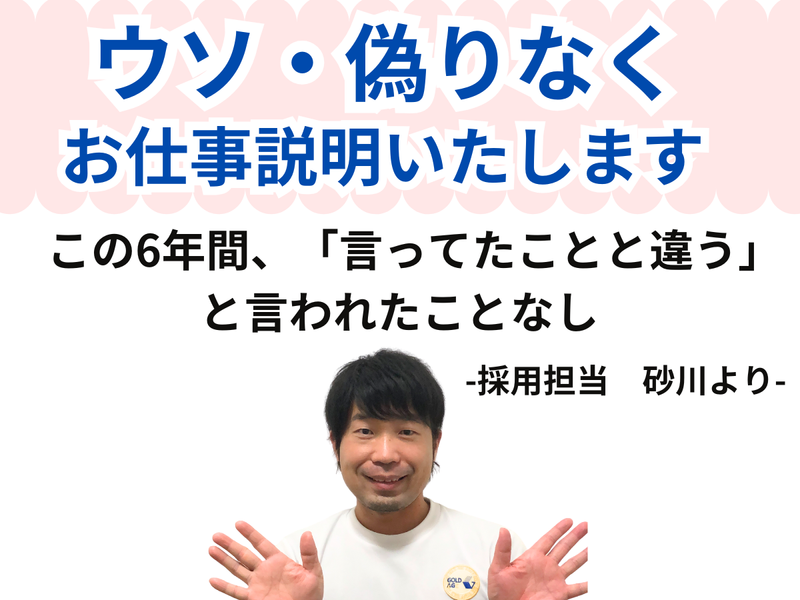 仕事内容 去年の8月に入社した新人さんも驚いた、 \\手厚い新人教育体制// 「経験者だからできるでしょ」 なんて言わないので安心してください。 ―アピールポイント――――――――――― ■あなたを放置しない 30日間マンツーマン教育 ■施設内の入居者の介護。車の運転なし ■リーダー業務や毎月の書類作成もなし ■業界平均を上回る年間休日115日 ■適性検査で厄介な人は採用しない体制 (だから職場の雰囲気は良好。派閥もなし) ―――――――――――――――――――― サービス付き高齢者住宅にて、 入居者様の日常生活のサポートをお任せ! ご自分で歩いたり、トイレに行ける方が多く、 意思疎通ができる方がほとんどです。 入居者27名中、 ・歩ける人 15名 ・車椅子の人 12名 ・オムツの人 3名 ◇具体的な仕事内容  ̄ ̄ ̄ ̄ ̄ ̄ ̄ ̄ ̄ ̄ ※流れ作業のオムツ交換がないので体がラク ※車での移動なし。運転中の事故も心配なし ※食事の調理なし。介護に集中できます ==【訪問介護】== 居室にて最大60分、1対1でじっくり関わります。 以下の介護サービスを行います。 ▼掃除と洗濯 ・掃除機での床清掃 ・洗面台やトイレ掃除 ・シーツ交換 ・洗濯機や乾燥機での衣類のお洗濯 ▼入浴介助 ・着替えの準備 ・更衣介助 ・個浴にて洗体 ・髪をドライヤーで乾かす ▼買い物同行(車は使いません) ・日用品などの買い物に同行 ・歩けない方は車椅子を使用 ▼記録 ・記録はタブレットを使用 ※タブレットの使い方はきちんと教えます ==【生活支援】== 入居者様に以下の介護を提供します。 ●各居室を巡視(安否確認) ●コール対応 ●トイレ介助 ●パット交換など ●10時のお茶提供 ●洗濯物たたみ ●食堂への誘導 ●配膳や下膳 ●お薬の配薬 ●レク ●就寝介助 ●記録(※訪問の記録はタブレットを使用) ※タブレットの使い方はきちんと教えます ◆訪問介護 (早番)の1日の流れ ・・・・・・・・・・・・・・・・・・・・・・・・・・・・・・・・・* 6:30-8:00 起床介助・トイレ誘導・食堂へ誘導 8:00-9:00 食事見守り・服薬介助・口腔ケア 9:00-12:00 掃除洗濯・入浴介助・買い物同行・記録 12:00-13:00 昼休憩 13:00-16:00 掃除洗濯・入浴介助・買い物同行・記録 16:00 退勤 ※15:30~16:00は30分の残業です ※残業代は100%支給します ◆訪問介護 (遅番)の1日の流れ ・・・・・・・・・・・・・・・・・・・・・・・・・・・・・・・・・* 10:00-12:00 申送り・掃除・洗濯・入浴介助・買い物同行 12:00-13:00 食事見守り・服薬介助・配膳下膳 13:00-14:00 昼休憩 14:00-17:00 掃除洗濯・入浴介助・買い物同行・記録 17:00-18:00 食事見守り・服薬介助・配膳下膳 18:00-19:30 就寝介助 19:30 退勤 ※19:00~19:30は30分の残業です ※残業代は100%支給します ◆生活支援 (遅番)の1日の流れ ・・・・・・・・・・・・・・・・・・・・・・・・・・・・・・・・・* 10:00-12:00 申送り・巡視・コール対応・お茶出し 12:00-13:00 食事見守り・服薬介助・配膳下膳 13:00-14:00 昼休憩 14:00-17:00 巡視・お茶出し・レク・コール対応 17:00-18:00 食事見守り・服薬介助 18:00-19:30 就寝介助・記録 19:30 退勤 ※19:00~19:30は30分の残業です ※残業代は100%支給します ▼教育体制  ̄ ̄ ̄ ̄ ̄ 入社後、30日間はマンツーマン指導します。 次の4つのステップで仕事を覚えます。 ①実際の仕事場面を見学 ②サービス提供責任者(サ責)と一緒に実施 ③実際に1人で実施(サ責も同行します) ④覚えてきたら独り立ち この方法を6年間続けています。 仕事を覚えられなかった人は1人もいません。 ※もし、不安なら何度でも教えるのでご安心 ください ▼現場で困った事があったら  ̄ ̄ ̄ ̄ ̄ ̄ ̄ ̄ ̄ ̄ ̄ ̄ ̄ サービス提供責任者や、先輩職員が 徒歩数十秒のところにいます。 困った事があれば、すぐに相談できます。 ◇通勤について  ̄ ̄ ̄ ̄ ̄ ̄ ̄ ̄ ̄ ̄ 車通勤OK!無料駐車場あり。 自転車・バイク通勤も通勤も可能。 最寄り駅(JR身延線 甲斐住吉駅) からは徒歩10分! 転勤はありません◎ ◇この職場の従業員インタビュー  ̄ ̄ ̄ ̄ ̄ ̄ ̄ ̄ ̄ ̄ ̄ ̄ ̄ ̄ ̄ ■女性スタッフより/40代 介護職 / 職場の雰囲気が良いです☆ \ この職場は、スタッフ同士の助け合う文化が できている職場だと感じます。 職員同士の「ありがとう」という声のかけ合 いがあるから、9年間も勤められています ■女性スタッフより/50代 介護職 / 利用者さんと向き合えます♪ \ ここに来る前は、 小規模多機能で働いていました。 大勢の利用者さんの対応で、どうしても 1日中バタバタしてしまうことが多かったです。 ここに来てからは、時間に追われることも減 り利用者さんと向き合えている感じがします。 30分や1時間、自分の持ち時間があるので、 余裕をもって1対1で対応ができています。 利用者さん1人1人と向き合う時間が増える ことで、やりがいにも繋がっています♪ ■男性スタッフより/40代 介護職 / 利用者さんの要望を聞けて良いです! \ 前職では、病院勤務をしていました。 病室の端から端までオムツ交換をしたり 次々と行う体位交換