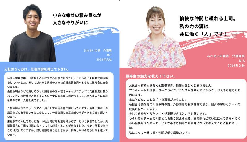 選考プロセス 【STEP1】応募 「応募画面へ進む」より 必要事項を入力。 たった1分で完了します。 ▼ 【STEP2】日程調整 担当者よりお電話、 またはメールにて ご連絡いたします。 現在お勤め中の方も、 面接日時は柔軟に 調整しますので、 お気軽にご相談ください。 ▼ 【STEP3】施設見学・面接(1回) 「本当に営業はないの?」 「職場の雰囲気は?」 まずはあなたの目で 確かめてください。 履歴書だけでは 分からないあなたの 「経験」や「想い」を お聞きしたいので、 リラックスして お越しください。 ▼ 【STEP4】内定・入社 面接から7日以内に 結果をご連絡します。 入社日はご希望を考慮し 決定いたします。 ━━━━━━━━━━━━━━━━━━━━ ✅面接は1回のみ! ✅施設見学のみも大歓迎! 「まずは話を聞いてから 応募するか決めたい」 という方も、 ぜひお気軽にご連絡ください。 ━━━━━━━━━━━━━━━━━━━━ ⭐施設見学も随時実施しております! <更に詳しい内容はHP、動画参照ください> ⭐HP https://www.reijukai.or.jp/ ⭐施設紹介動画 https://www.youtube.com/watch?v=0od9Elr2wtk&t=88s ※リンクではないので、コピーしていただき 検索していただけると幸いです。