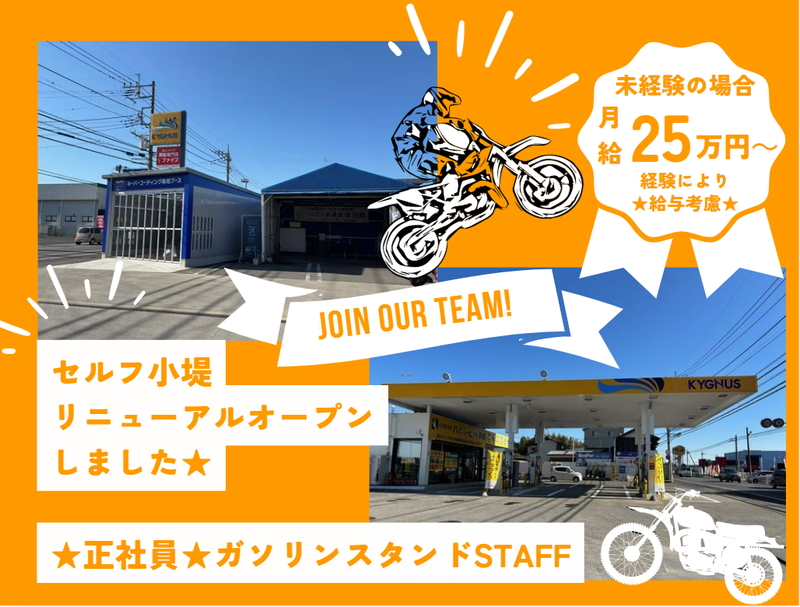 仕事内容 ☆★2024年12月にリニューアルオープン!!★☆ 【正社員】ガソリンスタンドスタッフ 主に、スタンド業務、店舗内の清掃、手洗い洗車からスタートします。 少しづつ慣れてきたら、 車のコーティング作業、オイル交換などをお任せいたします。 普通自動車免許があればOKです◎ また、整備士お持ちの方は、 オイル交換やタイヤ交換・パンク修理、 バッテリー交換、点検などもお任せいたします。 整備士お持ちの方は、給与考慮いたします◎ ※シフトにより、セルフ354総和給油所の勤務の日もございます。 ≪セルフ小堤勤務/20歳社員の声≫ 職場を一言で表すと「笑顔で常に明るい!」 さまざまな年代の人が働いていて、 仕事中は歳の差関係なくみんなお客様の為に笑顔で全力で働いています! 固定の休みもあるので、同年代の友人と毎週遊んでます! オンとオフ。仕事も遊びも全力でエネルギーを使い切れる職場! ★景気に左右されず安定した会社★ 昇進のチャンスも随時有!働きながらスキルや技術が身に付けられる☆