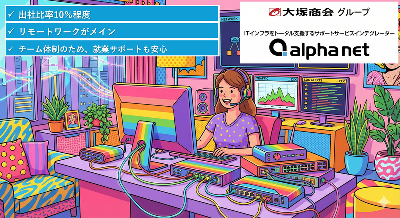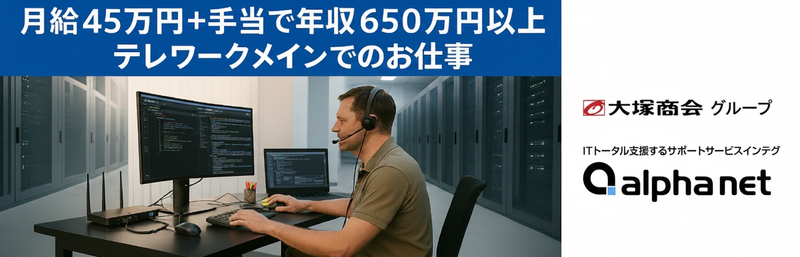 仕事内容 【仕事内容】 = サーバ構築の経験を得たいネットワークエンジニアを募集 = 【この求人のポイント】 ✅ 大塚商会グループの安定企業(充実の福利厚生) ✅ リモートワーク主体での勤務 ✅ ネットワークエンジニアをしながらサーバの技術/知識を習得出来る ✅ オンプレミスからクラウドまで幅広い環境構築経験が得られる ✅ UTM製品などのセキュリティ知識が活かせる ✅ 月給45万円+各種手当で年収650万円以上も ✅ 活躍次第で昇給のチャンス ✅ 正社員登用の実績あり 【業務概要】 システム基盤構築においてネットワークまわりの調査からプロダクト選択の支援/補佐 システム基盤構築(ネットワーク構築/サーバ構築) 【主な業務内容】 ▶ ネットワークの調査~設計~構築~テスト ▶ サーバの調査~設計~構築~テスト ▶ UTMのプロダクト選定~設計~構築 ▶ 作業に付随するドキュメント作成 ――――― ◎アルファネットって、こんな会社です ――――― 私たちアルファネットは、企業活動に欠かせないITインフラをトータルで支援するサポートサービスインテグレーターです。大規模なシステム構築から、エンドユーザー向けヘルプデスク業務まで、幅広いプロジェクトに参加しています。 「ITでオフィスを元気にする」大塚商会のグループ企業として、自分たちの仕事を「サービス業」だと捉え、「技術の前に人」を標榜。サービスを提供するのは「人」であり、その品質はすべて「人」に掛かっているという考えのもと、テクニカル系に加え、ヒューマンスキル系の教育にも力を入れています。 【アルファネットで働く魅力】 ✍ 「大塚商会グループ」の安定基盤と充実した福利厚生 ✍ 東証プライム上場グループで売上高約1兆1000億円超(決算年2024年度) ✍ ITインフラ業界のリーディングカンパニー 【市場価値を高める成長環境】 ✍ 様々な業界知識とともに、クラウド技術・オンプレミス環境の構築など、多彩なスキルが習得可能 ✍ 大手企業の重要システム構築・運用を通じて実践的なスキルが身につく環境 ✍ 技術研修制度が充実しており、最新技術の習得やスキルアップを会社全体でサポート