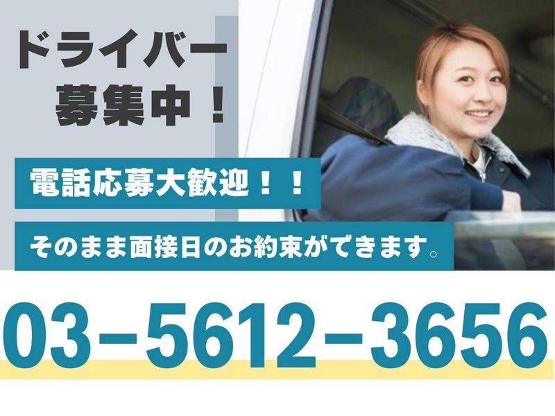 選考プロセス 最後までお読みいただき ありがとうございます。 お電話いただければ、 その場で面接日のお話しもできます。 応募連絡先:03-5612-3656 <面接について> 面接というよりは、 こちらから仕事内容のご説明や、 免許証の確認などをさせていただきます。 準備は不要ですが、 履歴書(写真は無くてOK)と 免許証をお持ちください。 当日は私服でお越しいただいて構いません。 それでは、お会いできる日を楽しみにしております!