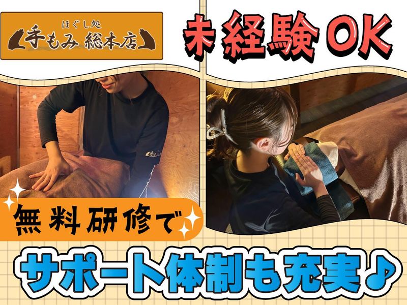 仕事内容 ボディケア、リフレクソロジー、リンパアロマ等の施術がメインのお仕事になります。 経験者はもちろん、未経験者も大歓迎♪ 研修中もデビュー後もしっかりサポートします。 【保証給付き条件】もあり、初めての方も安心して働いていただけます♪ ◆「手に職」はAI時代に強い武器! 人の手による癒しは代替困難です。 リラクゼーションセラピストの最大の価値は「人と人との触れ合い」「温もり」「共感」にあります。 AIが発達すればするほど「人間らしいケア」に対するニーズが高まると考えられます。 「あなたにしかできない癒し」を私たちと一緒に提供していきましょう♪ ◆説明会・見学会も開催中! 「応募の前にいかがでしょうか♪」 「興味はあるけど応募の前段階でもう少し知りたい」 「お店の雰囲気をみたい」という方はお気軽にご参加ください♪ 気になることなどご質問にもお答えさせて頂きます。 ご来店の希望日時をご連絡ください。 ◆手もみ総本店のココが魅力 私たちはただほぐすだけではなく「心身ともにリラックスしていただく」ことを大切にしています。 技術はもちろん「気遣いやおもてなし」の気持ちも大事。 でもご安心を! 今働いているスタッフの多くも未経験からのスタートです。 だからこそ新人さんの気持ちがわかり、しっかりサポートできます! お客様の「笑顔」や「ありがとう」がやりがいに。 頑張り次第でしっかり稼げるのも魅力のひとつです! 「質の高い研修」が勤務店舗にて無料で受けられ、あなたのペースに合わせて進めます。 経験を積めば報酬もアップ!効率よく稼げます♪
