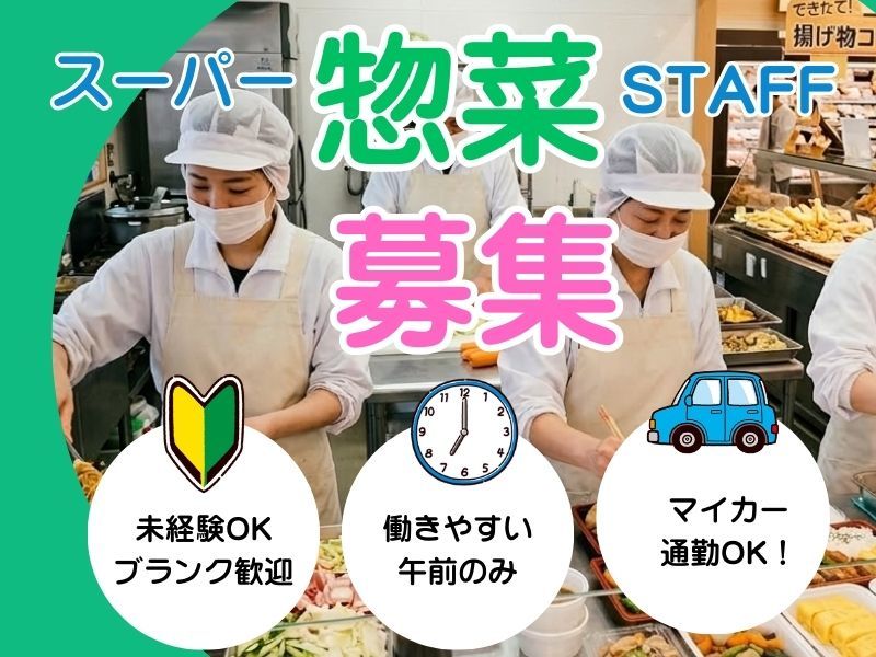 スーパー惣菜売場/7時~12時/未経験歓迎/調理・盛り付け・品出し/高時給1200円/交通費あり/マイカー通勤可/週払いOK/扶養内勤務相談OK