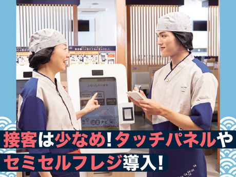 仕事内容 \タッチパネル式でオーダーなしのシンプル業務/ ドリンクの提供、テーブルの片付け テイクアウトの受付・お渡し お会計などのホール(フロア)業務をお任せします。 しっかりとしたマニュアルはもちろんのこと ゼロから丁寧にサポートします! 気付けば一人立ち出来る方がほとんどです。 *接客は少なめで楽ちん 初めてのバイトに付きものなのが「接客の不安」 基本的に席のご案内は機械が行い 注文はタッチパネル式なので、接客は少なめ! 「久しぶりの仕事復帰」という方も沢山います! 皆さん数日で慣れることが出来ていますよ! *セミセルフレジでとにかく簡単! バーコードをスキャンしてレシートを渡すだけ! セミセルフレジなので、お釣りも自動で計算。 お金に触らないので間違える心配もありません! *職場の雰囲気は… 先輩や店長が親切に教えてくれる。 マニュアルや教育がしっかり整っていて安心。 気軽に質問が出来る雰囲気がある。 とアルバイトからは働きやすい環境と好評です! 忙しい時間帯でも、周りと協力して仕事を進めるので 終わった後には達成感が生まれます! \はま寿司で働くメリットをご紹介/ 柔軟なシフトで急なお休みも相談出来る環境です。 お得にメニューが食べられる食事補助あり!(規定あり) 初級・中級・上級のステージごとに時給UP! 頑張りがしっかり給与に反映されます。