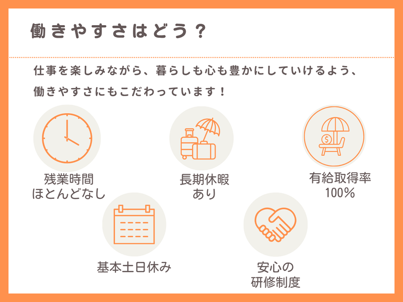 休日休暇 週休2日制(土、日) ※祝日は出勤となります。 【休暇制度】 ⭐年に3回の長期休暇あり⭐ 1週間~10日程度のお休みで 仕事とプライベートのメリハリをつけて 働くことができます✨ ・GW休暇 ・夏季休暇 ・年末年始休暇 ・慶弔休暇 【有給休暇】 10日~20日(※入社半年後、有給取得可) ⭐有給は半日単位で取得可能⭐ 「ちょっと通院に行きたい…」 「役所や金融機関窓口にいきたい…」 そんなときでも、 半日からサクッと有給取得OK♪ 1日使うまでもない予定も、 無駄なく調整できて安心です✨ しかも、有給消化率は驚異の100%! しっかり休める文化が根付いています♪